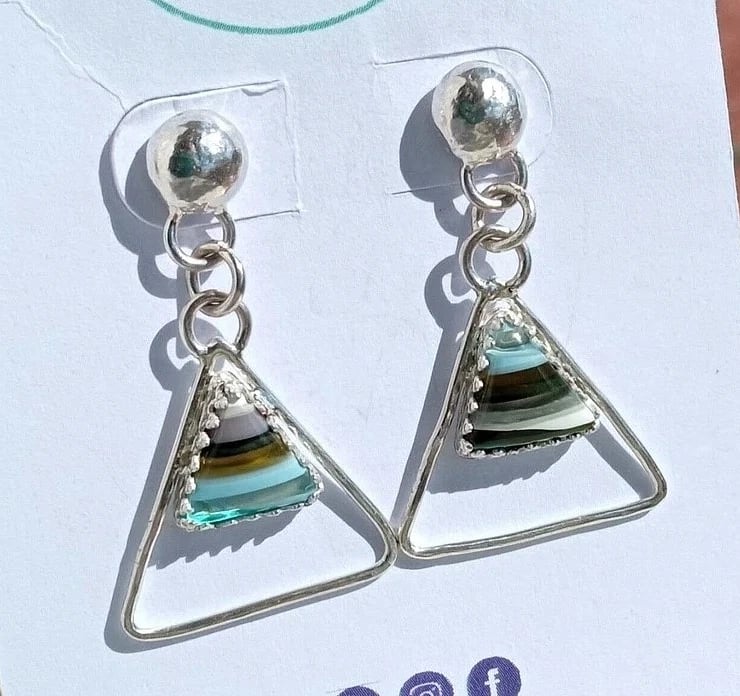 Set in ornate design sterling silver around the Surfite, solid silver back, hammered texture sterling silver triangles and handcast organic solid silver studs with sterling silver posts and butterflies