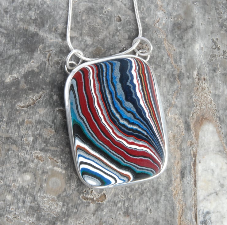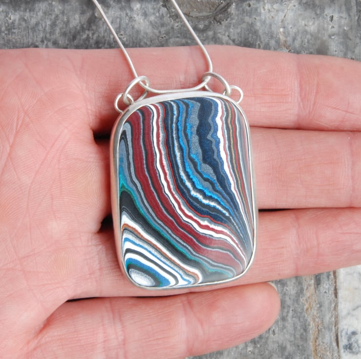 This large pendant has an oblong of fordite which has been bezel set in silver with two bails - one on each of the top corners. The fordite has broad wavey bands in darker colours - maroon, grey, black with a bit of blue and white to lift it up. It comes with an 18 inch silver snake chain but the bails are large enough that you could pop it onto a leather or rubber cord if you wanted it, you could also put a different chain through each bail to give an interesting layered look. Measures 42mm (excluding bails) by 31mm wide.