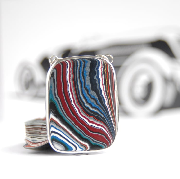 Fordite is layers of cured paint that built up in the old spray booths at car plants. The dealer I bought this particular material from believes it to have come from a Harley Davidson spray shop - the colours are certainly consistent with the colour charts I have found. Changes in how vehicles are painted mean that fordite is formed in small quantities and it is becoming increasingly difficult to source. I was lucky enough to get a parcel of this material so if you are after something slightly different or to match a beloved bike drop me a message and I'll see if I have what you are after.