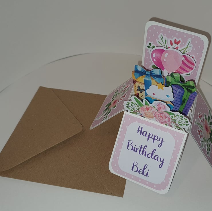 This card base is in white topped with pink papers and decorated with die cut balloons, presents, flowers and a lovely big cupcake. This card measures 14cm x 14cm when laid flat and fits in the envelope provided. Photo's show previously supplied cards, these can be customised to your liking.