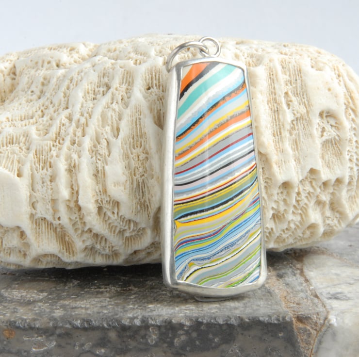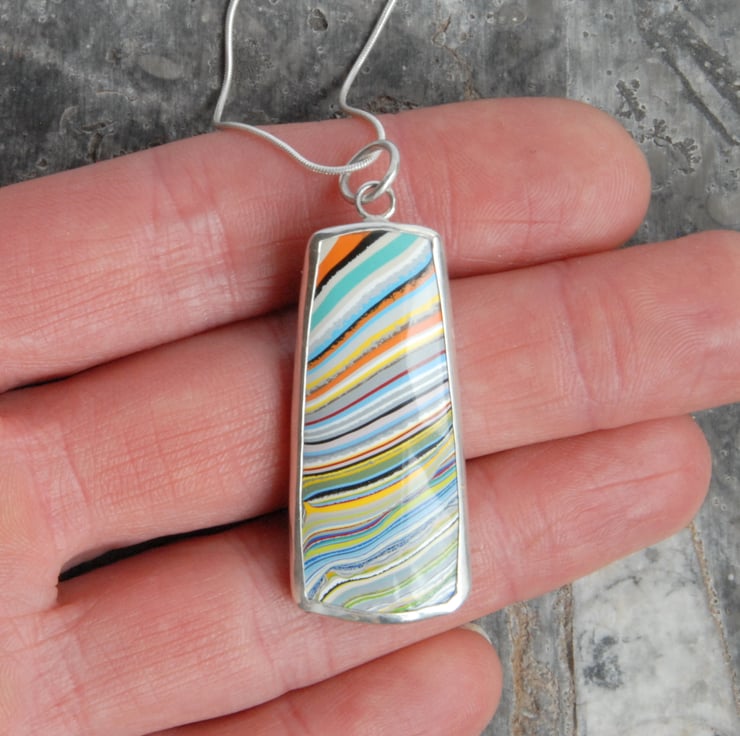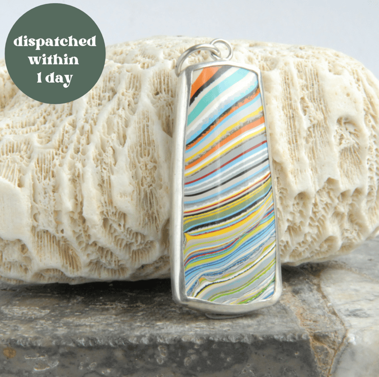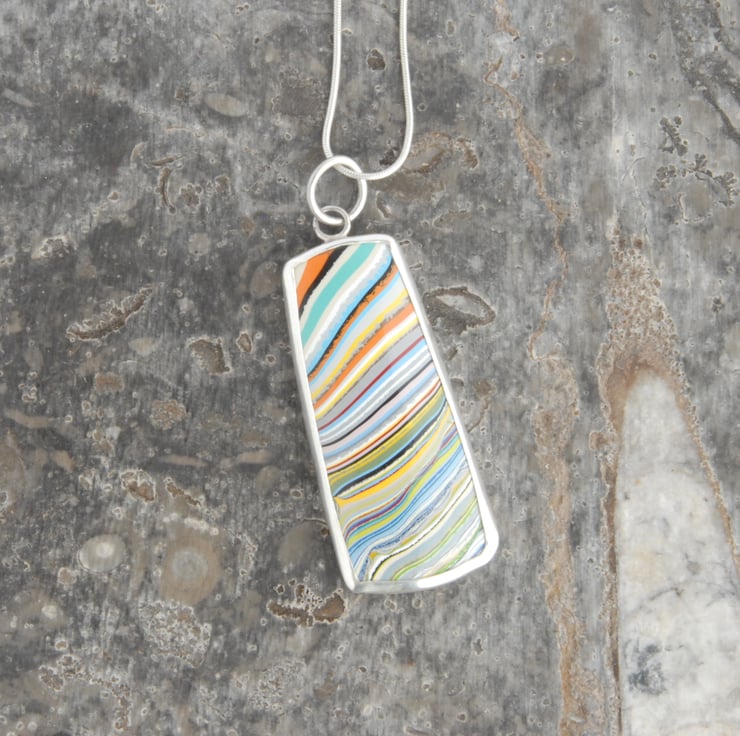 This summery pendant features an oblong of colourful boatite which is smoothly bezel set in sterling silver. The boatite has a pattern of diagonal wavey stripes in a mix of aqua, blue, orange, sunshine yellow, lime green, grey and white, since the pattern on the back is different I set the piece in a reversible setting so that it can be worn either way round. The pendant measures 47mm long (inc bail) by 18mm wide, it comes complete with a silver snake chain but you could easily transfer it to a ribbon or cord if you wanted to.