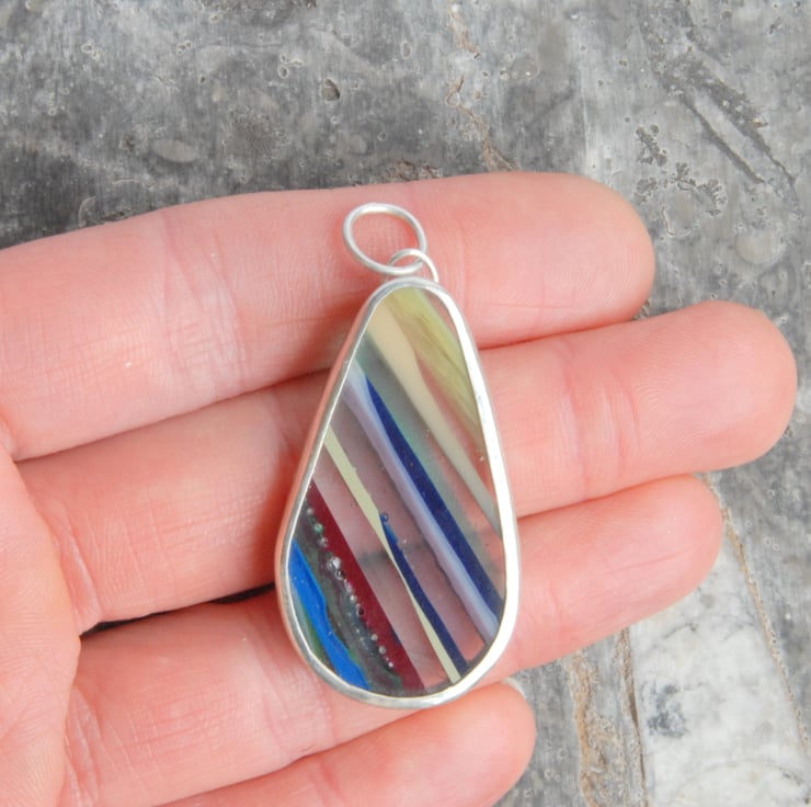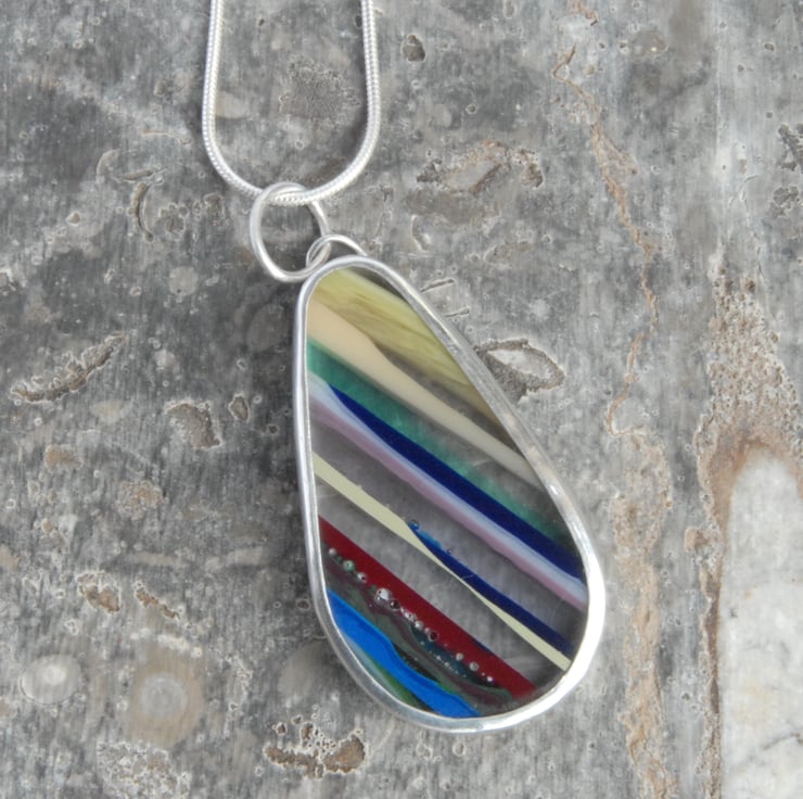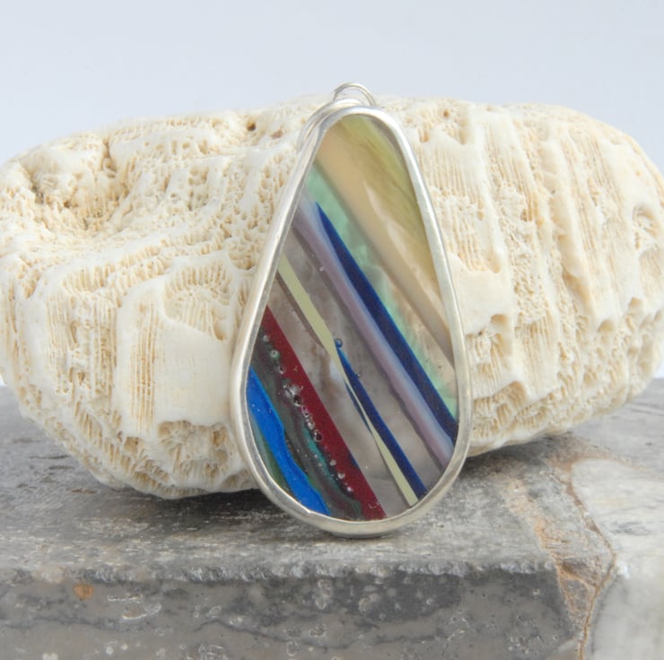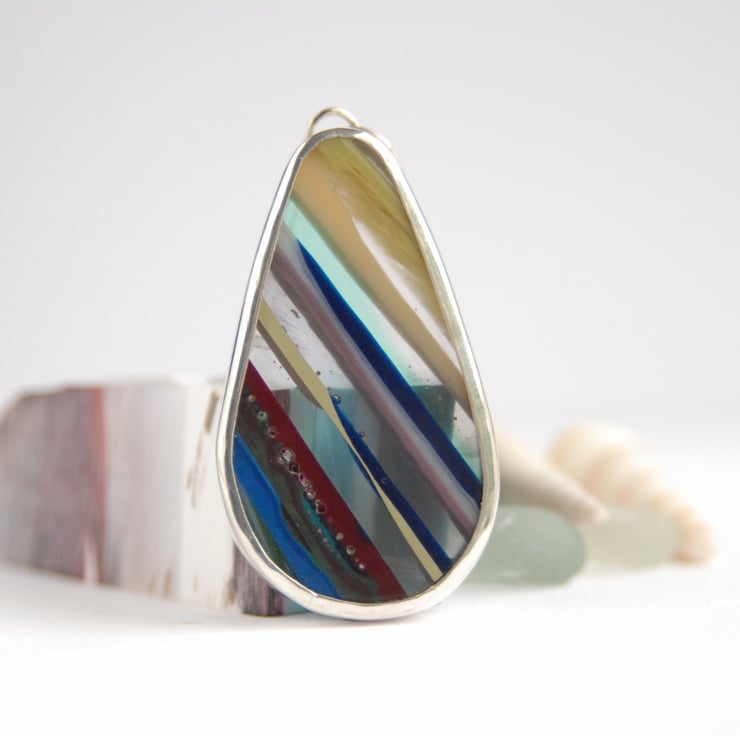 This muted pendant features a drop of sustainable surfite bezel set in recycled sterling silver. The surfite has diagonal stripes, a lot of them are clear resin but they are separated by bands of opaque navy, beige, dark red and muted pinky grey. Because of the open back of the setting the colour and pattern of what ever you are wearing will show through the pendant making it look different with each outfit. The pendant measures approx 50mm (inc bail) by 24mm wide, it comes complete with a sterling silver chain but the bail could easily fit a rubber or cotton thong if you wanted to swap it over. Comes in a sleek black box.