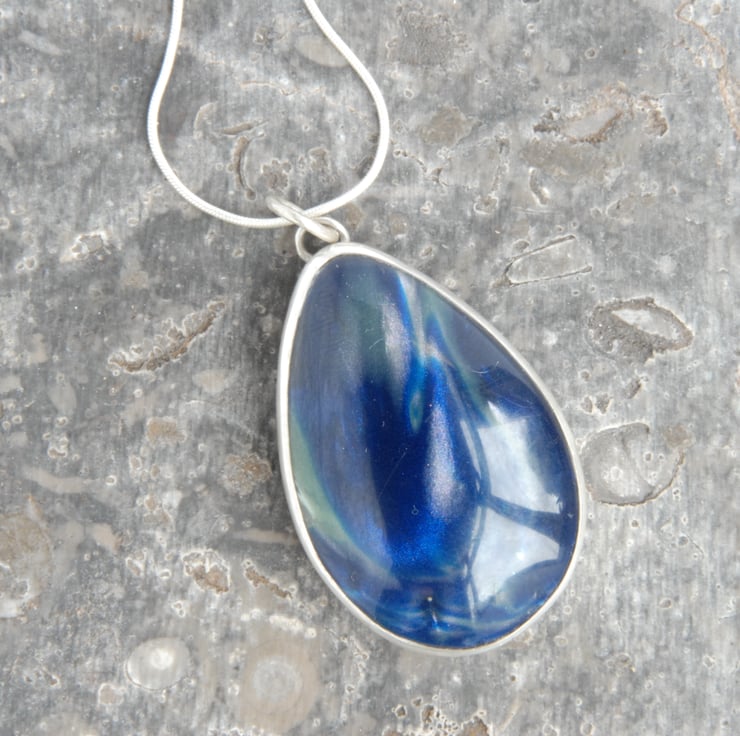 This pendant features a shimmery cabochon of bowlerite bezel set in sterling silver. Bowlerite is the name given to plastic recovered from old bowling balls, this particular one is a deep sparkly blue with veils of shimmery silvery white. This pendant has a classic drop shape (it's almost egg shape and the rich tones remind me of certain enamel easter eggs). If you love the idea of sustainable jewellery made from old bowling balls but not this shade of blue (or you want earrings/ cuff links) then drop me a message, I have a contact who buys the old balls at yard sales and then sells mixed boxes of chunks of the plastic, my box of rough has quite a range of colours in it.