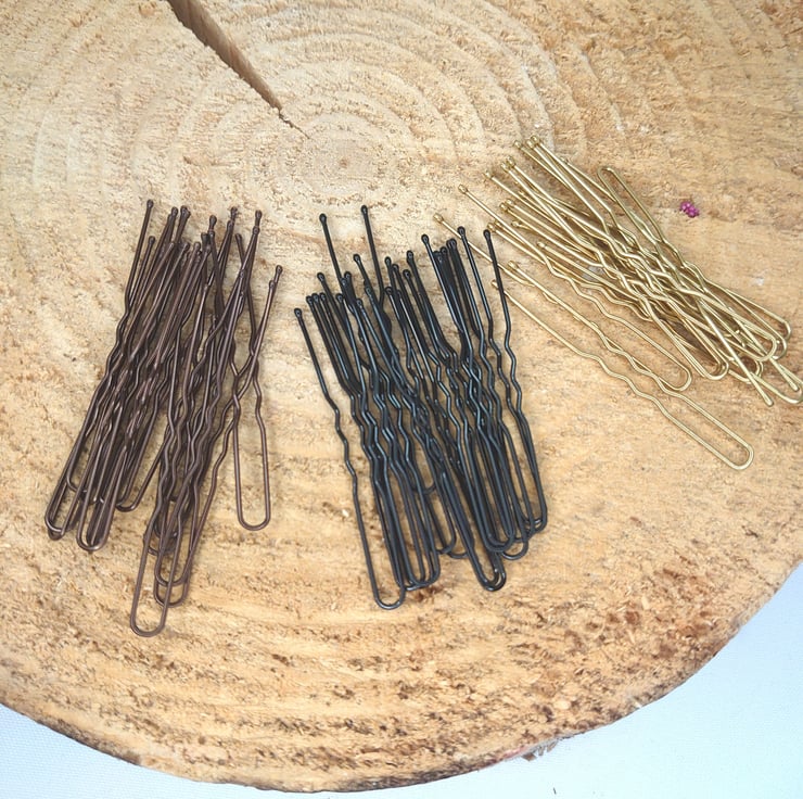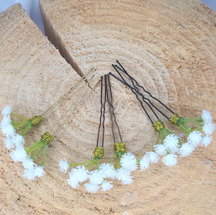 The hair pins are made up with a hand full of gypsophila wired and taped to the hair pin then bound by a green decorative wire. You can choose from a gold pin, black pin or brown pin.