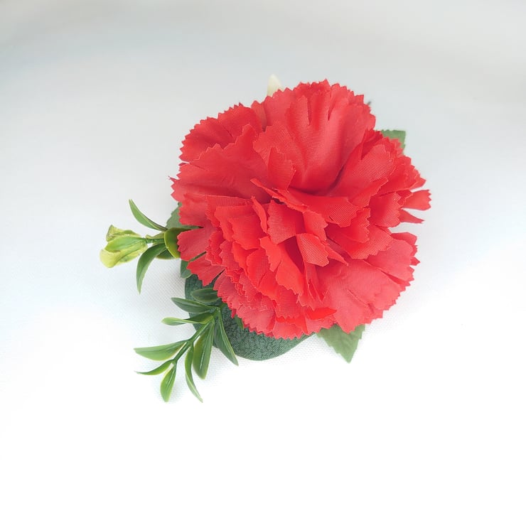 It is made up of one red carnation with a large eucalyptus leaf backing, two buxus sprigs, with green leaves and ivy to surround. All wired and taped professionally.