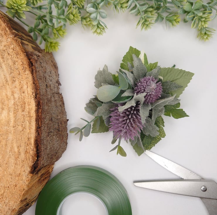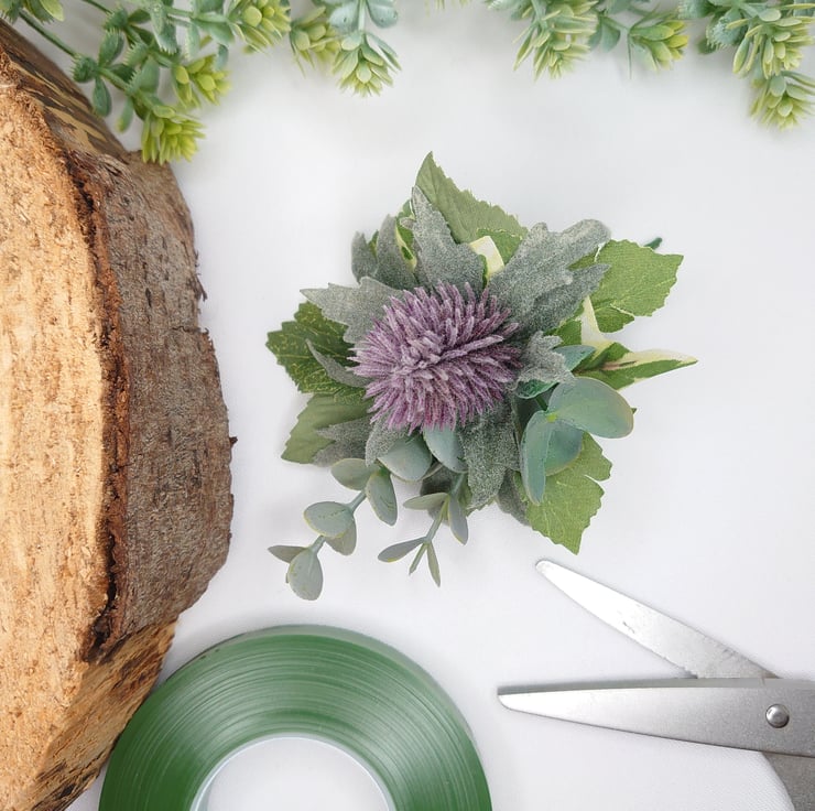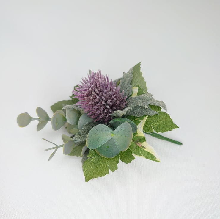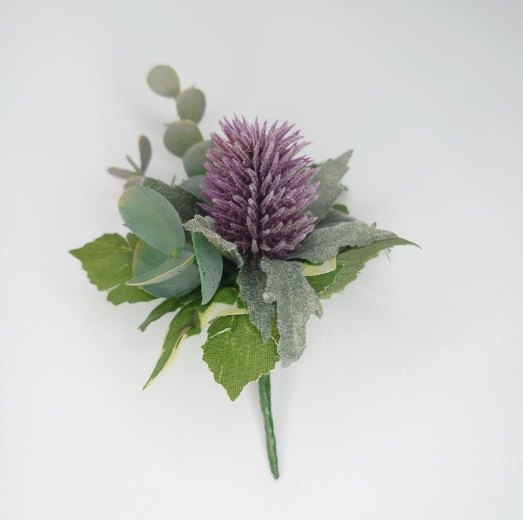 This buttonhole is a lovely classic soft thistle. It's put together with the choice of a single or double eryngium (Sea Holly) thistle head. Backed with a lovely selection of leaves including eucalyptus and ivy. All wired and taped professionally.