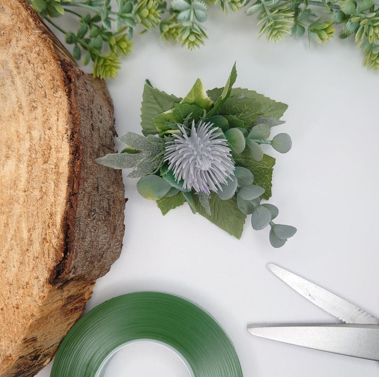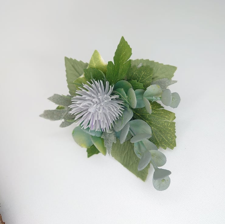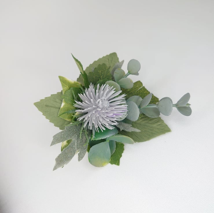 This buttonhole is a lovely classic soft thistle. It's put together with a lovely selection of leaves including eucalyptus and ivy. All wired and taped professionally.