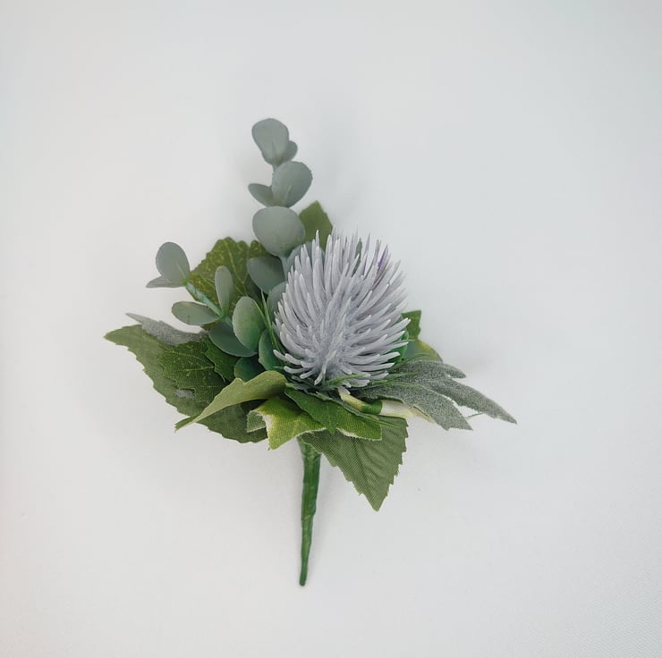Wild, beautiful eryngium thistle buttonhole. Lightweight artificial flowers.