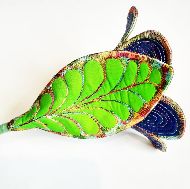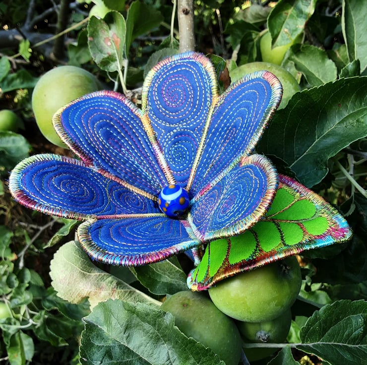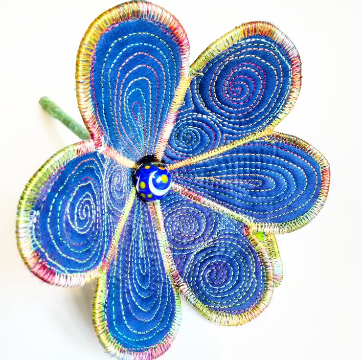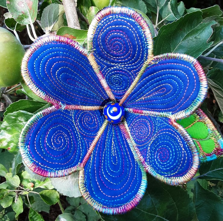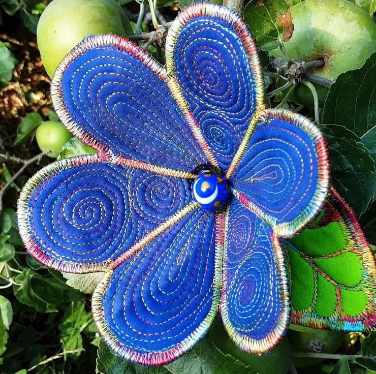 Made from layers of fabric including hand dyed Egyptian cotton and silk fabrics using the free machine embroidery style of sewing
