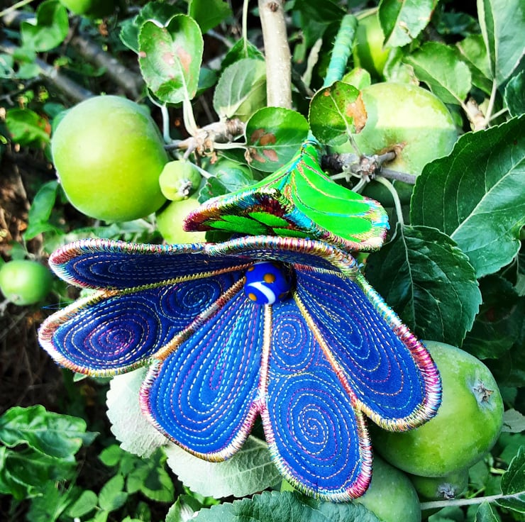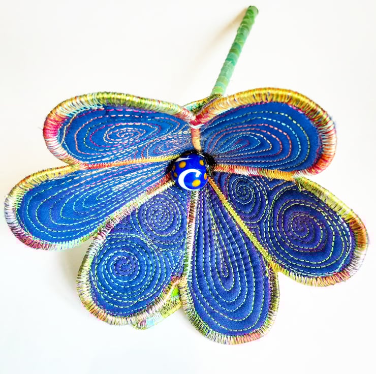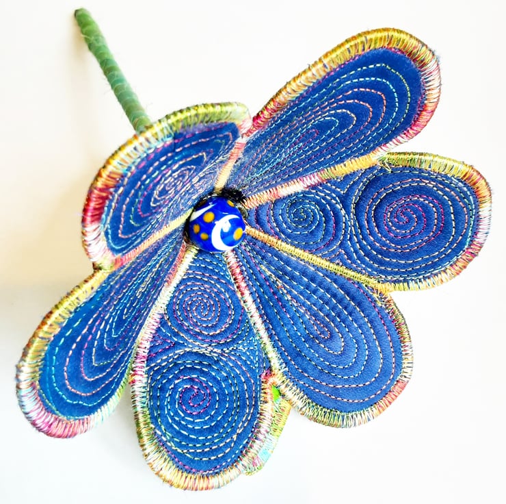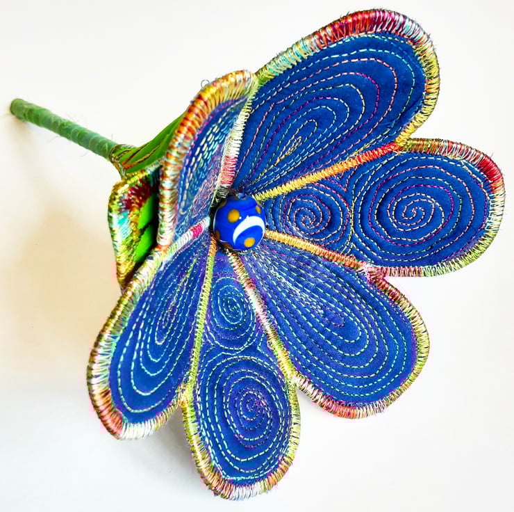 It has a flower with a glass bead in the middle, a green leaf coming out of the side and a wooden stem wrapped in green fabric.