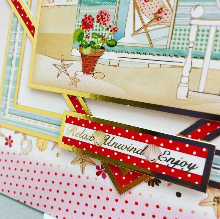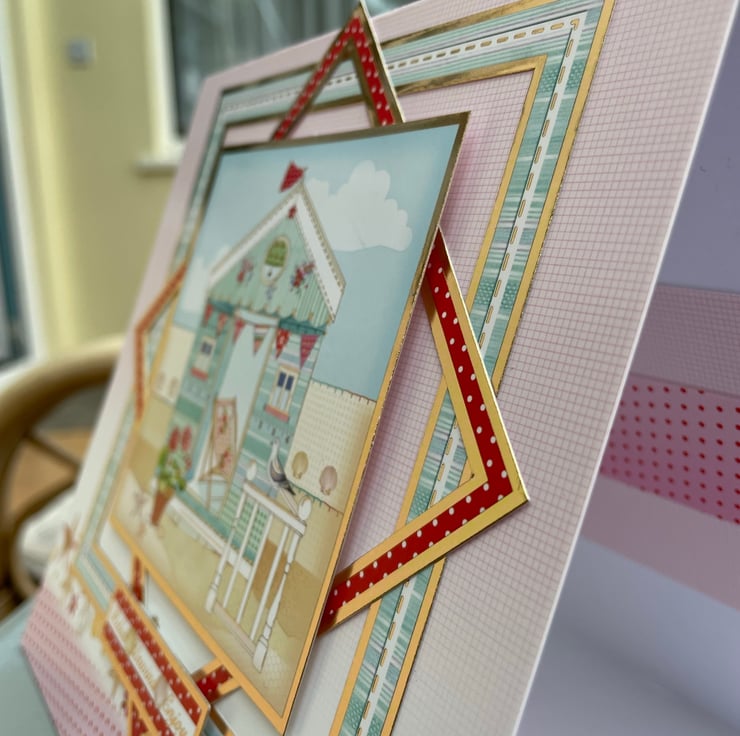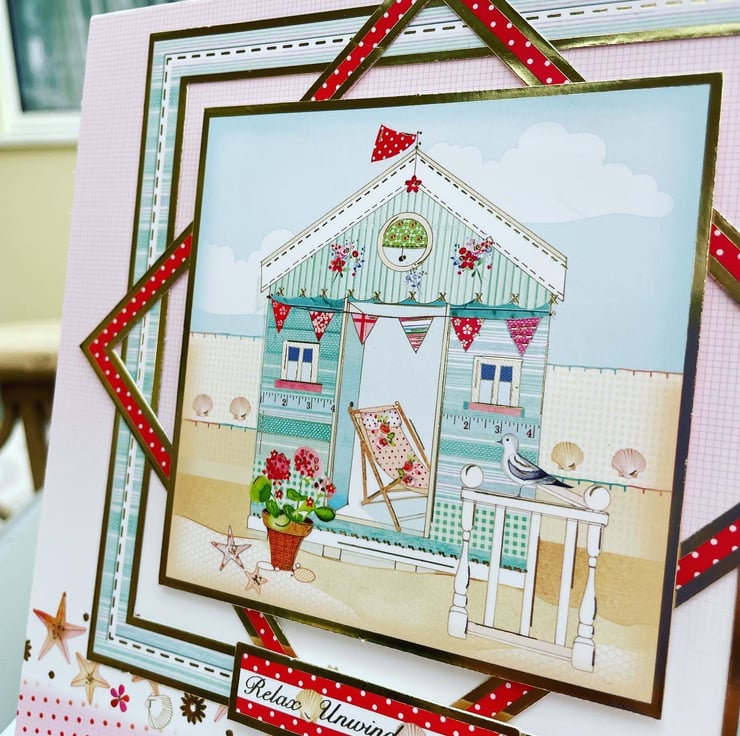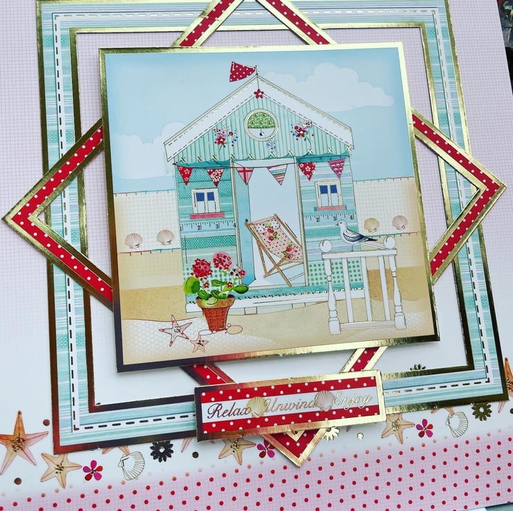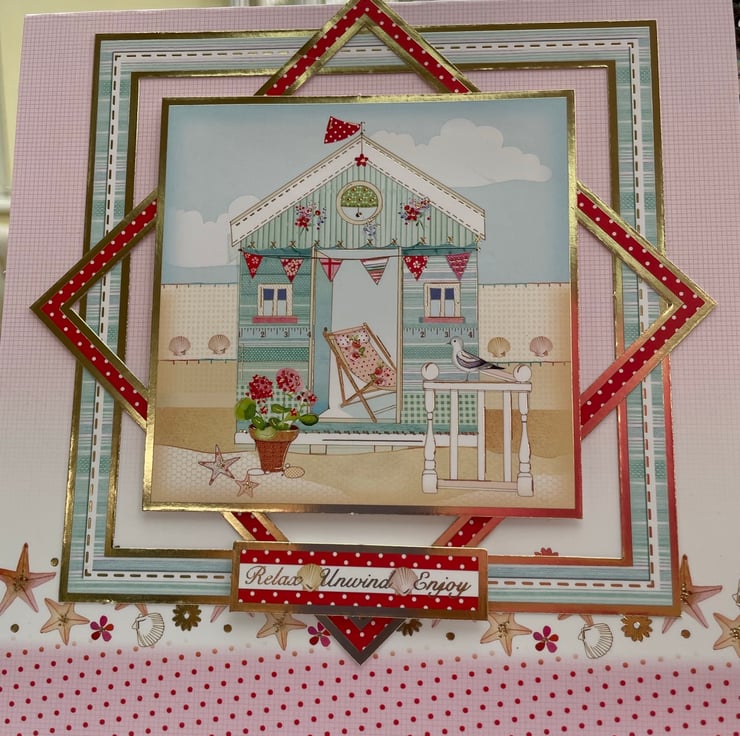 A beautiful amd summery card for many occations. This 7x7inch card features a beautiful beach hut with bunting, deckchair and flowers. It sits on a beach with shells, starfish and a seagull, a very tranquil setting. The main image is surrounded by a red polka dot frame and a striped blue frame. The base is a pale pink and is finishes with pink and red polka dots and starfish and shell border. The greeting is Relax, Unwind, Enjoy. Inside the card has a pink and polka dot border with the greeting To someone special. Tis makes the card very versatile for many occations such as birthday, thank you, anniversary or just to say!