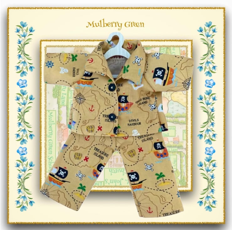 Cute little pyjamas in a pirate print, to fit the Mulberry Green characters. The pyjamas are made from best quality cotton and fasten at the front with two little poppers underneath the buttons.
