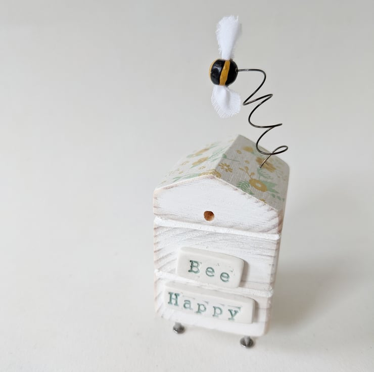 Painted white and sanded smooth the roof of the hive is adorned with flowers and the little bee dances on a bendy wire. The sign on the front reads 'Bee Happy' and is made from polymer clay which is shaped, fired and painted.