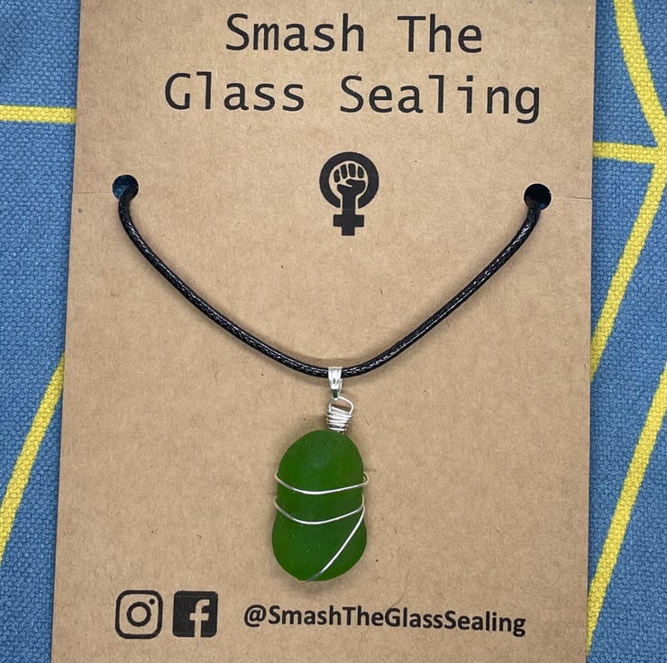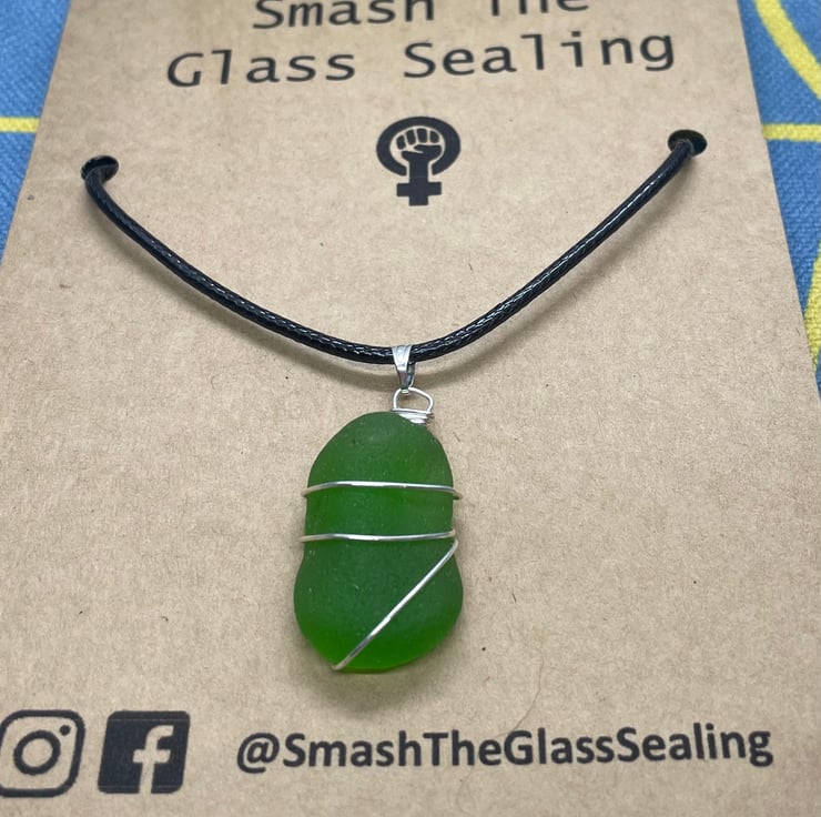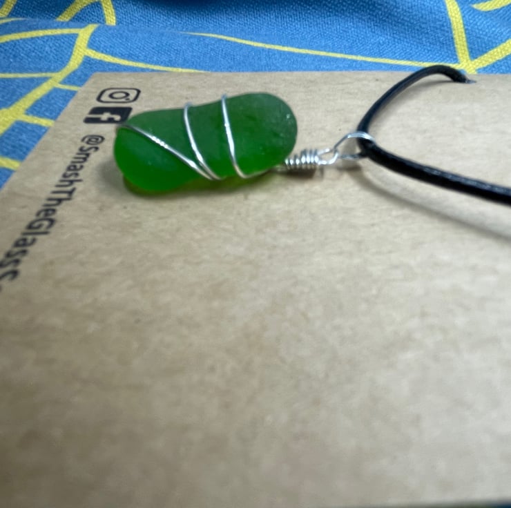 Beautiful rarer piece of bright green sea glass on a black leather look cord necklace - 20 inches on longest setting, smallest setting 17 inch chain. (I can swap this to a silver plated 18 inch chain on request). Silver plated wire wrap.