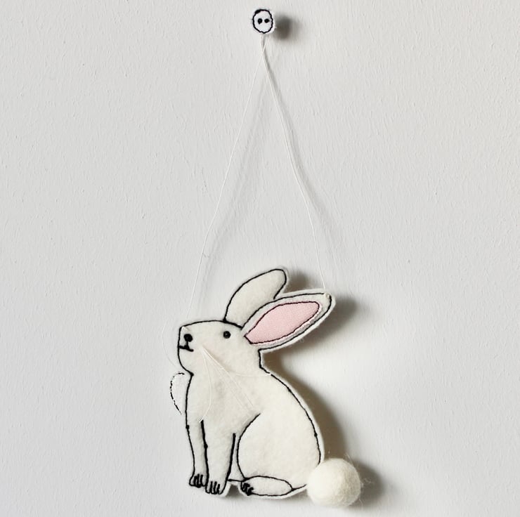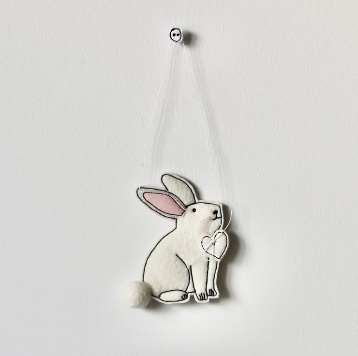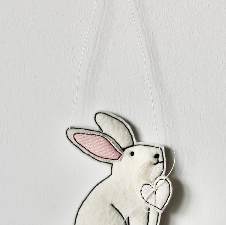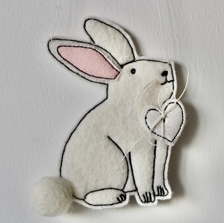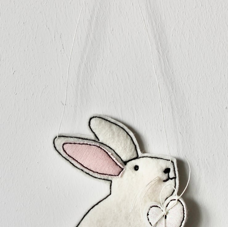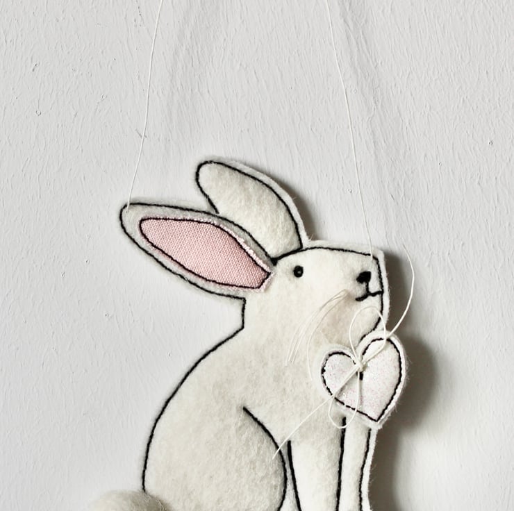 Little Bunny is created using 100% wool felt, glitter cloth, cotton cloth, free hand machine embroidery and is cut out by hand using very sharp scissors. With a handmade 100% wool felt ball tail, linen whiskers and a linen string to suspend.
