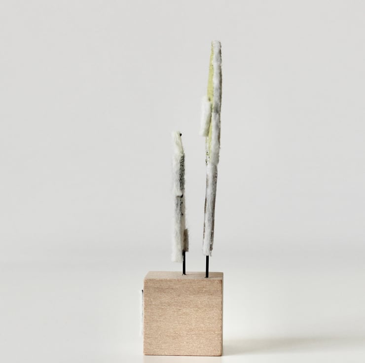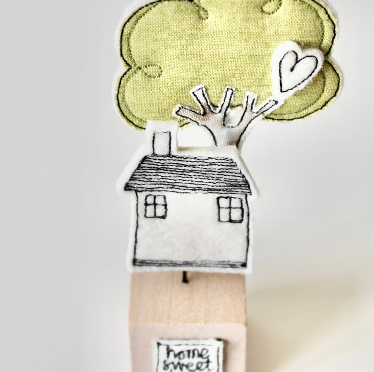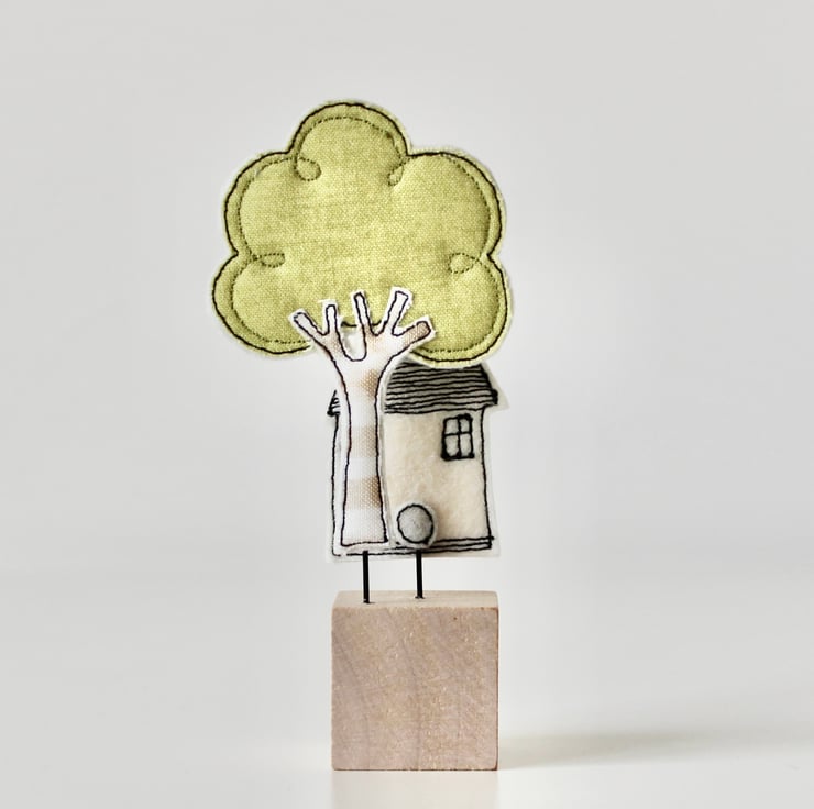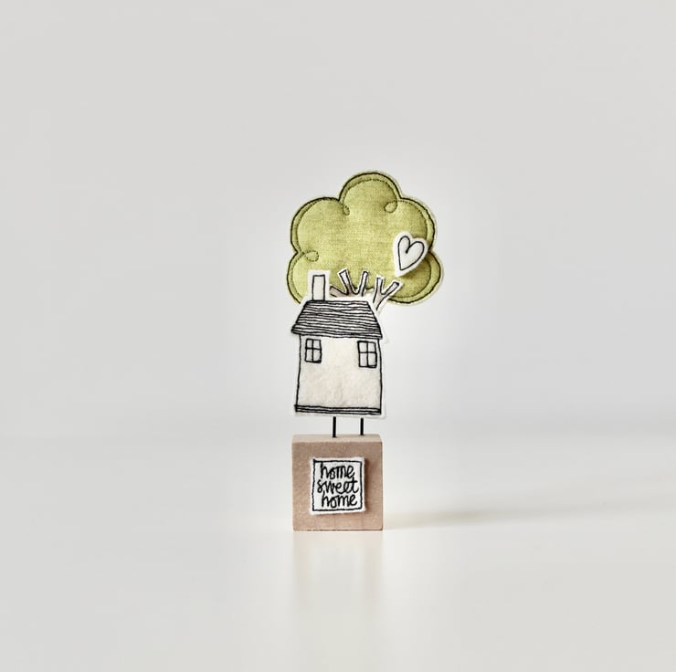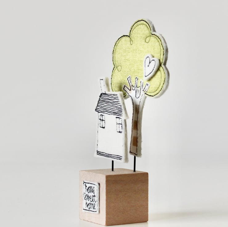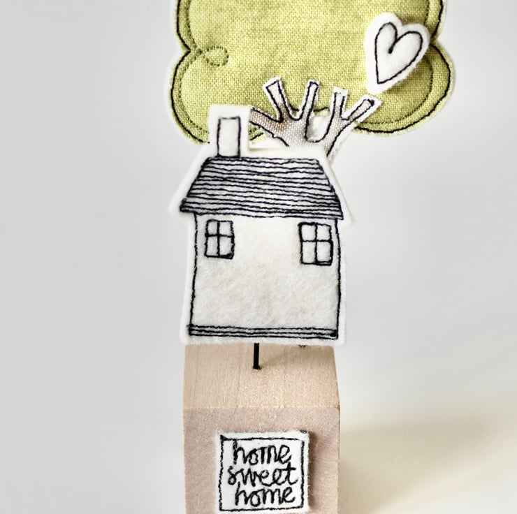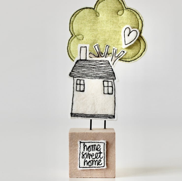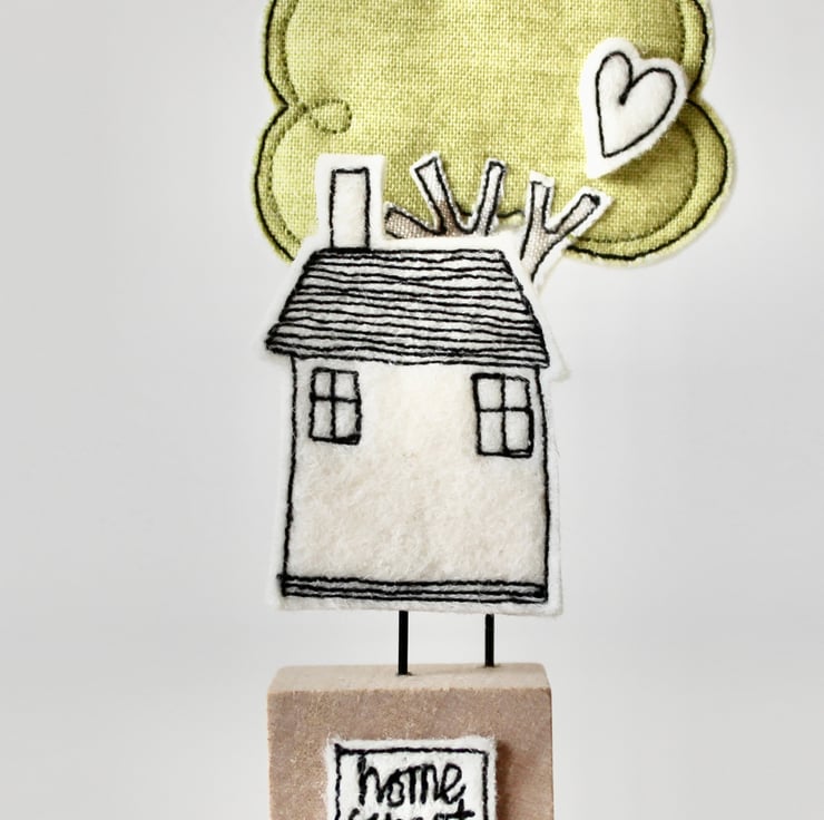 The house, tree, heart and 'home sweet home' label are sewn using 100% wool felt, cotton cloth and free hand machine embroidery; multiple layers of cloth are sewn together and cut out by hand using sharp scissors. Mounted on a 3cm cube wooden block which can adorn a mantle piece or any flat surface.