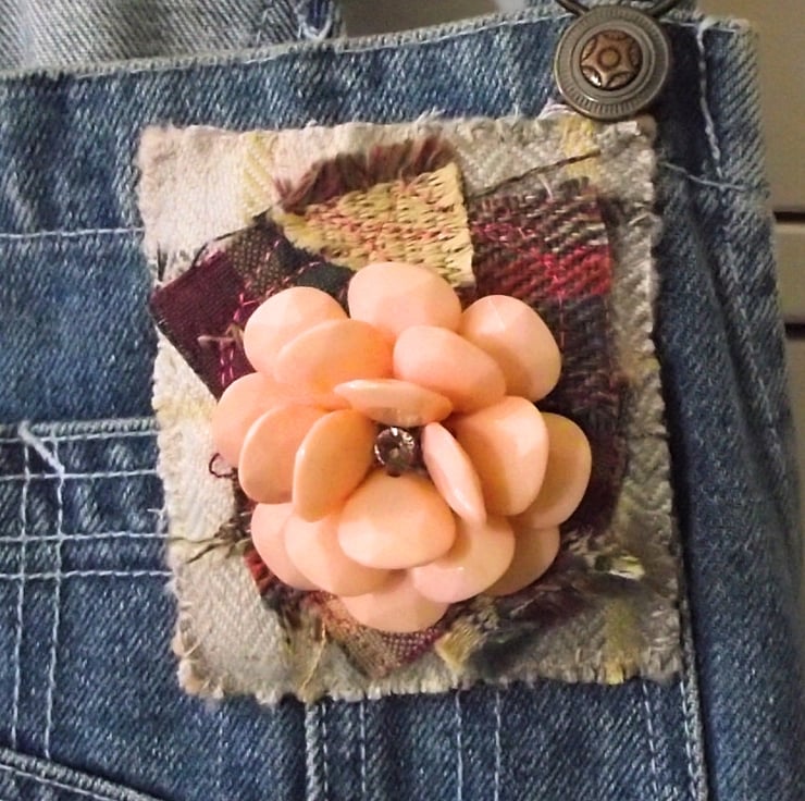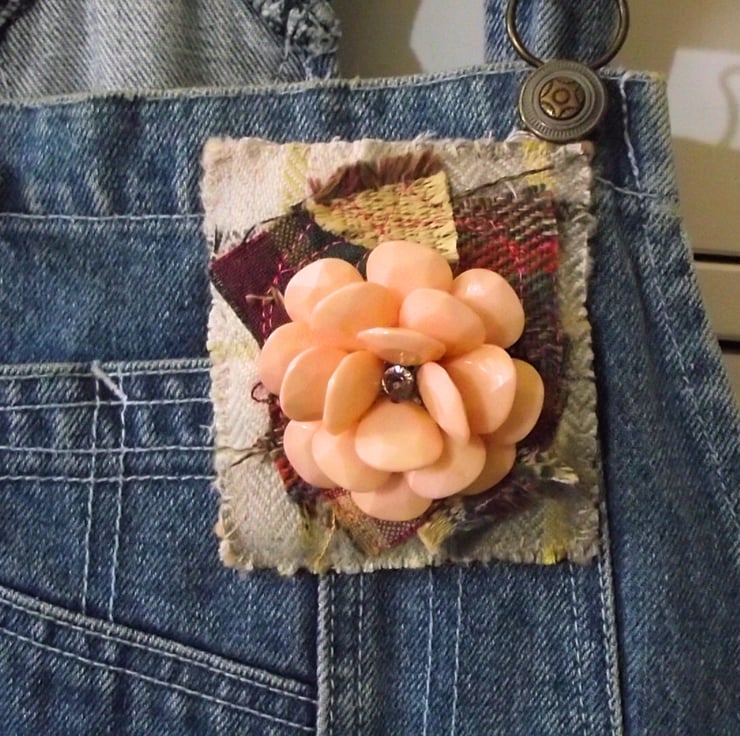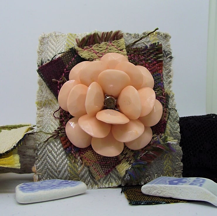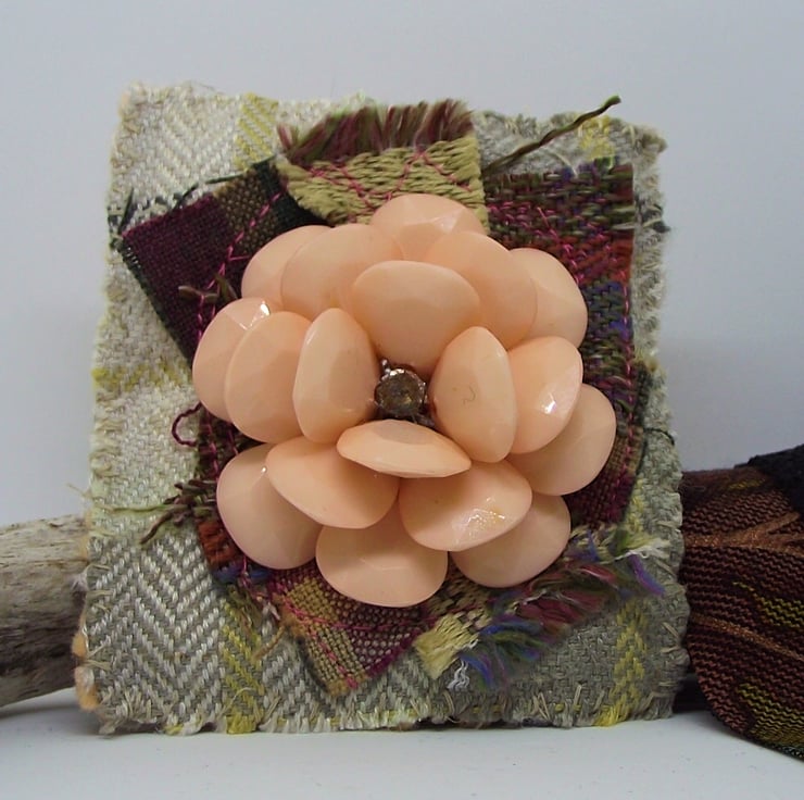 Shabby chic upcycled jewellery and textile brooch. Mixed tartan fabric with vintage recycled peach acrylic flower. Pale peach felt backing and locking pin brooch fastening. Brooch size 7.5 x 8.4cm.