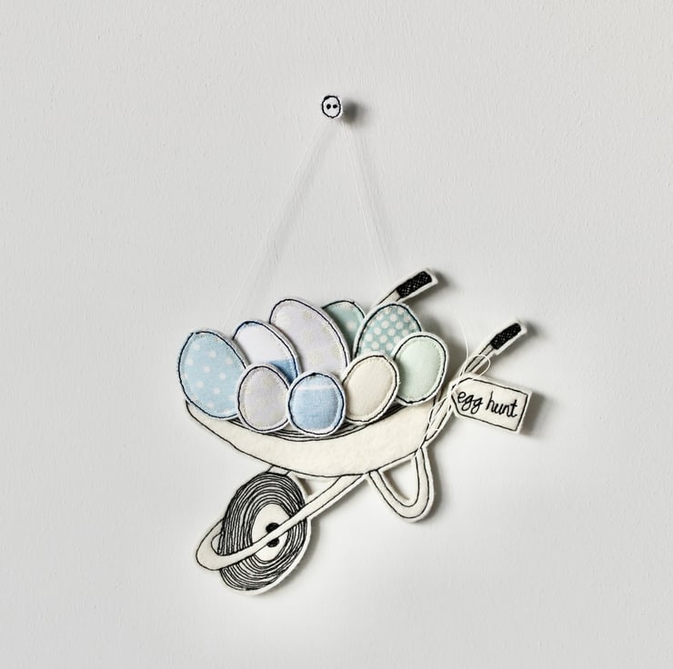 Hang this delightful sewn fabric wheelbarrow, filled with nine eggs, to remind yourself how much fun it is to go on an egg hunt.