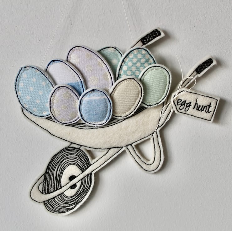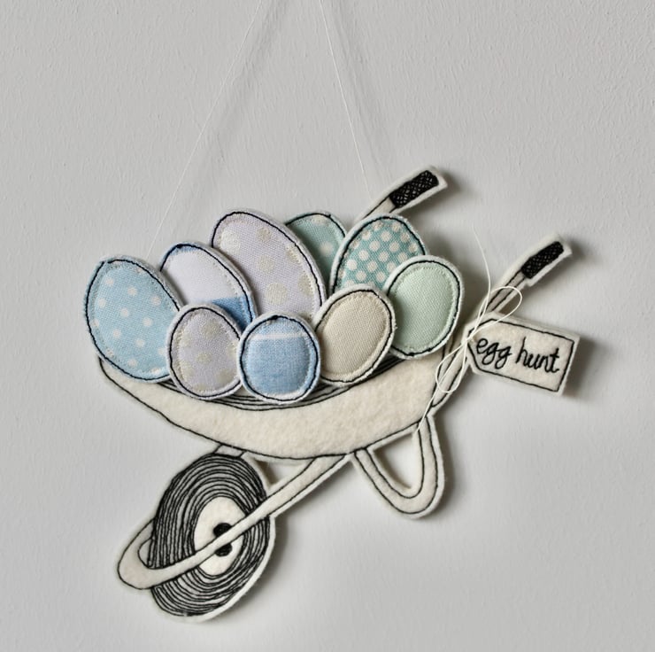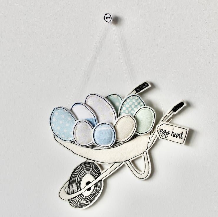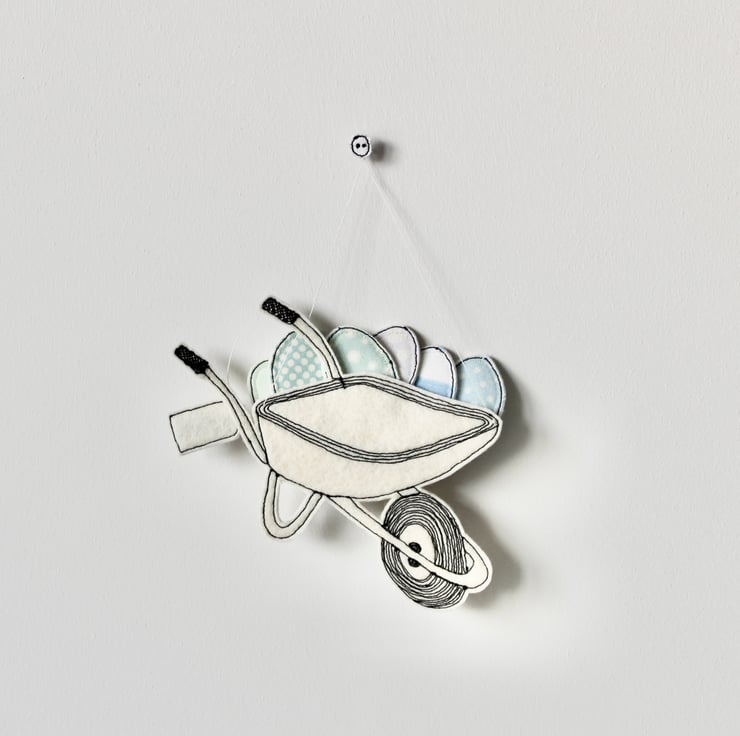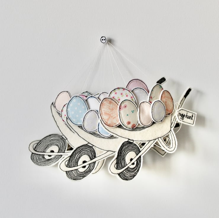 'Egg hunt' wheelbarrow is sewn using 100% wool felt, cotton cloth and free hand machine embroidery; multiple layers of cloth are sewn together and cut out by hand using very sharp scissors. With a linen string to suspend.