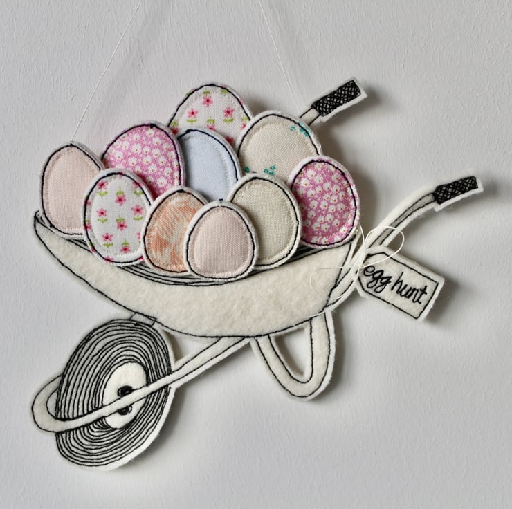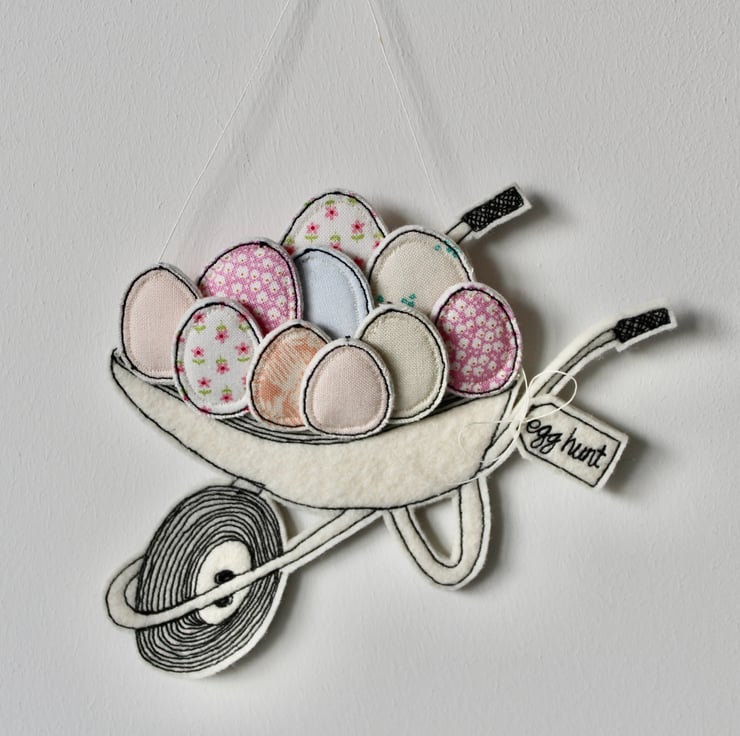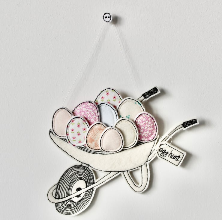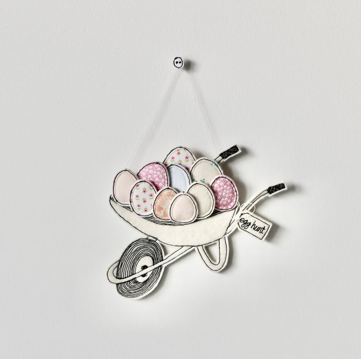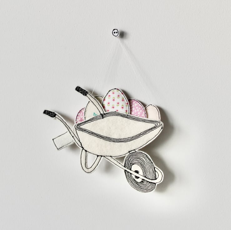 'Egg hunt' wheelbarrow is sewn using 100% wool felt, cotton cloth and free hand machine embroidery; multiple layers of cloth are sewn together and cut out by hand using very sharp scissors. With a linen string to suspend.
