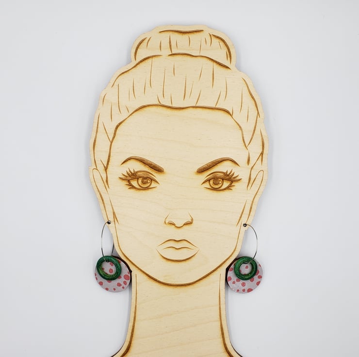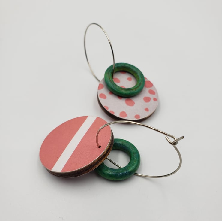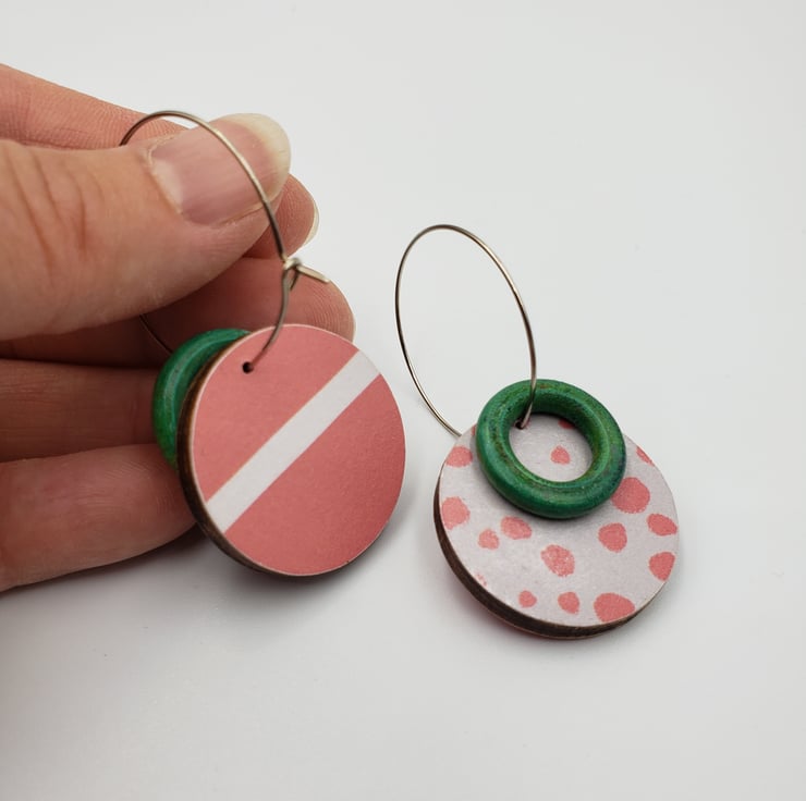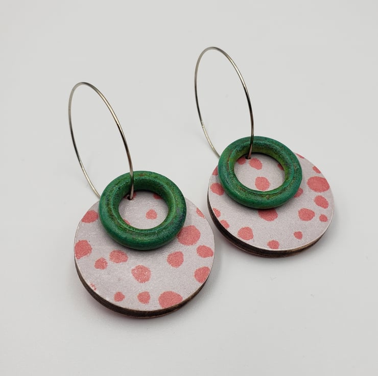 Cute dangly hooped earrings in a pink dotty theme on a light grey background. I love the colour of the added green hoop bead, I think it works lovely with the pink! (These can be removed if you prefer).