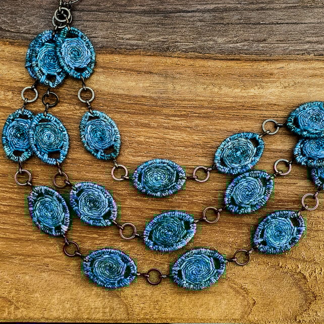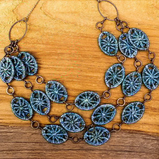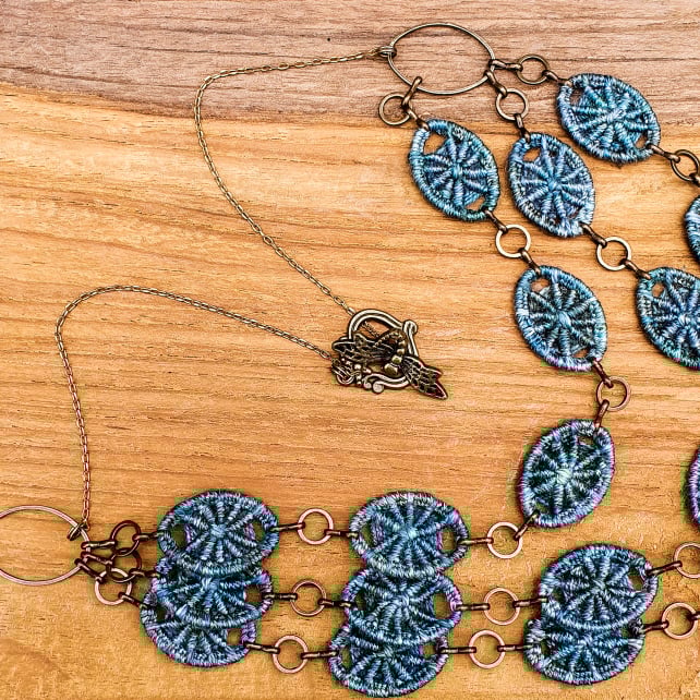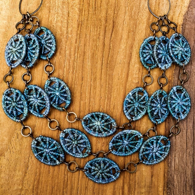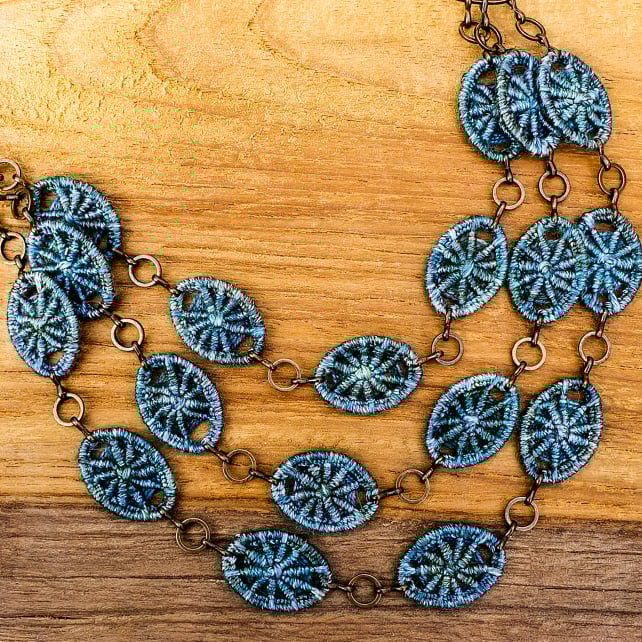 A gorgeous statement necklace featuring 18 handmade Dorset buttons in the traditional crosswheel style. Each Dorset button has been individually hand stitched in pure mulberry silk, giving them a luxuriously soft feel and beautiful sheen. They are also equally beautiful on both sides, so the necklace can be worn either way round depending on which pattern you prefer! The necklace is finished at the back with a raw brass chain and an antique brass dragonfly clasp.
