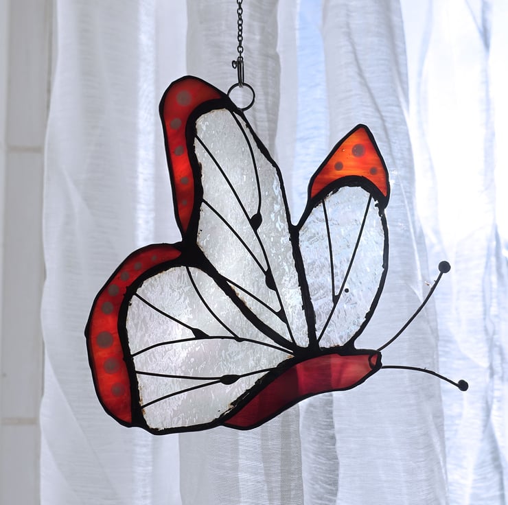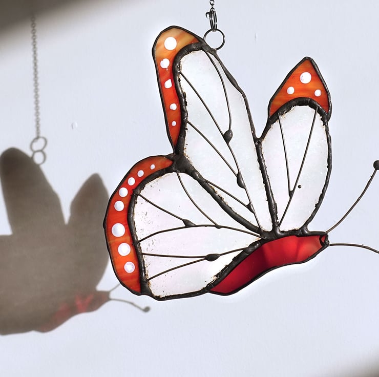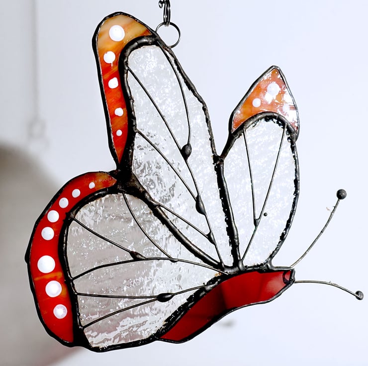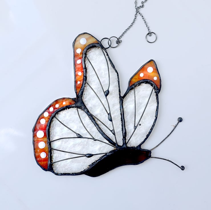 This lovely butterfly has wings of rainbow textured glass with mottled orange tips decorated with white dots. The veining on the wings is copper wire and the patina is black.