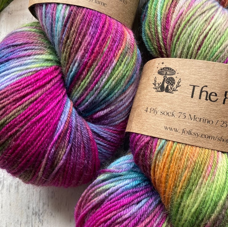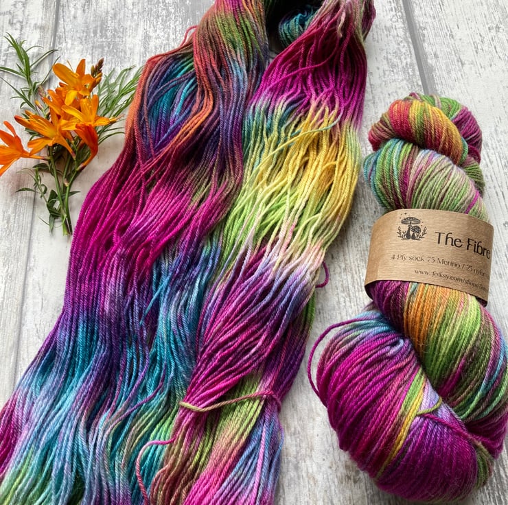 Skein of hand dyed yarn 75/25 merino nylon that has bounce and beauty and great for socks, shawls, mitts or whatever takes your fancy.