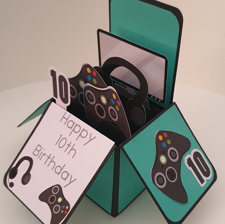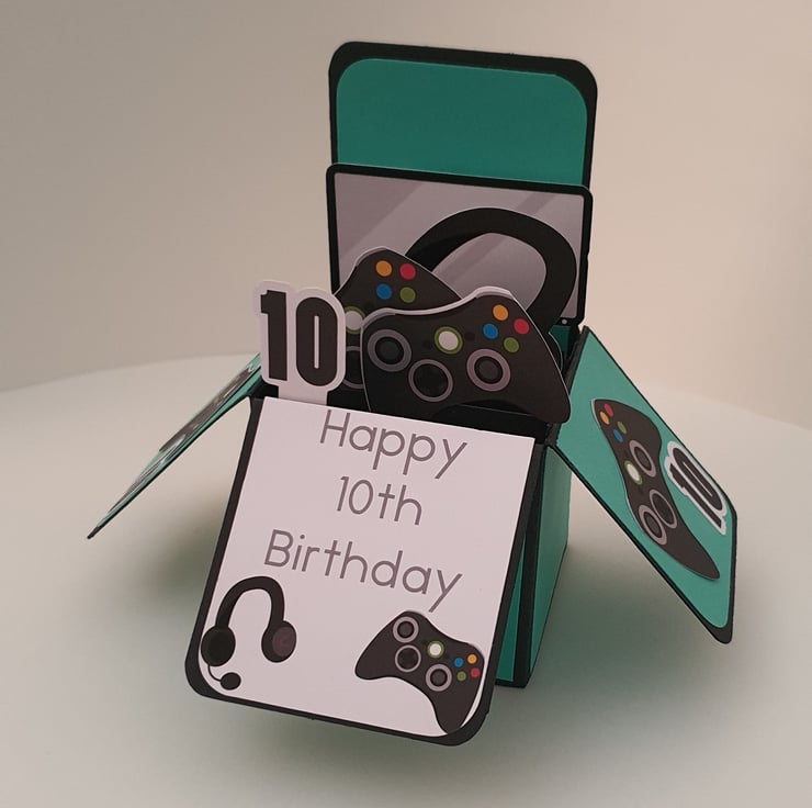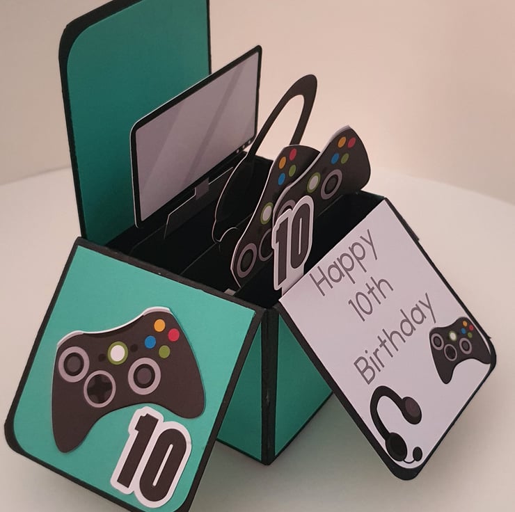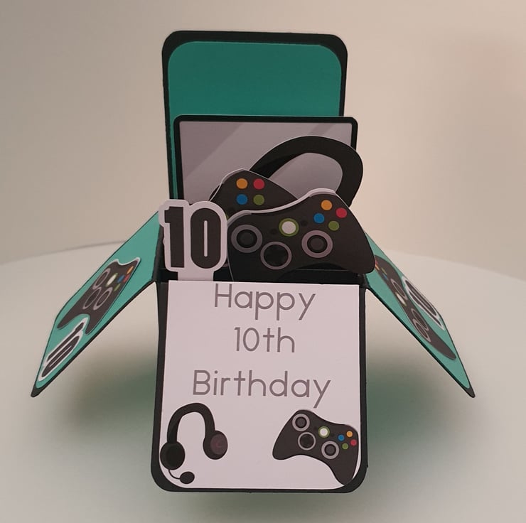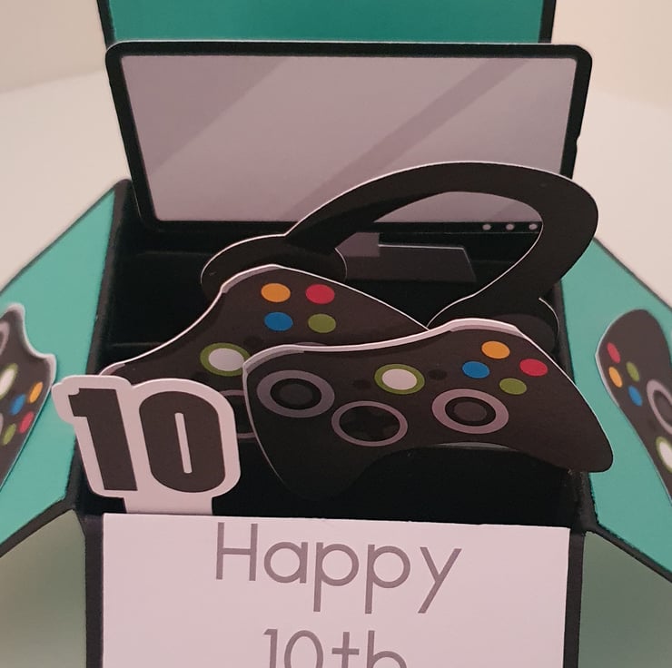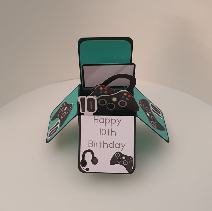This card is a black base topped with green card and decorated with PC and console die cut images. The front of the card reads "Happy 10th Birthday" but this can be changed to a message of your choosing, just complete the question when ordering the card and perhaps include the recipients name and or age.