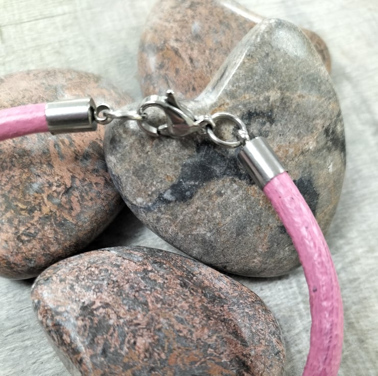 The overall length is approx 7.5inches and has a lobster catch on 4mm pink leather.