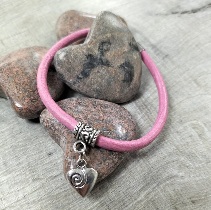 Pink leather bracelet with silver colour heart charm that is loose on the bracelet so have the freedom to move around.