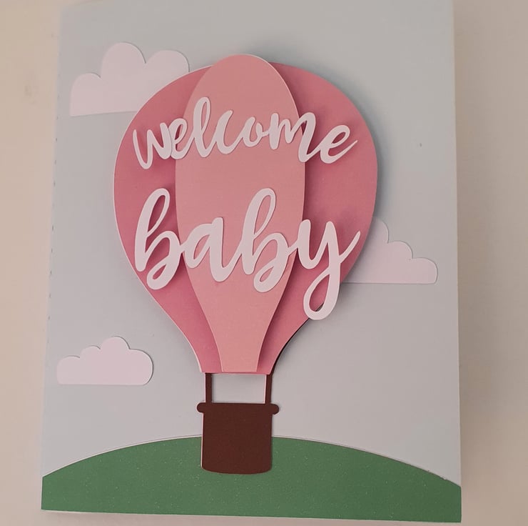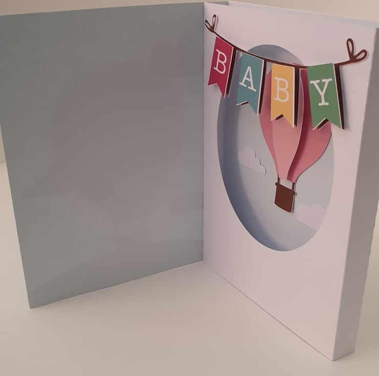 Front of the card has a small hot air balloon with a "Welcome Baby" message, the inside of the card has a 3d image of a hot air balloon with bunting reading Baby. The inside of the card can have a printed message and the colour of the balloon can be altered to your choice, please answer the questions to add the message you would like.