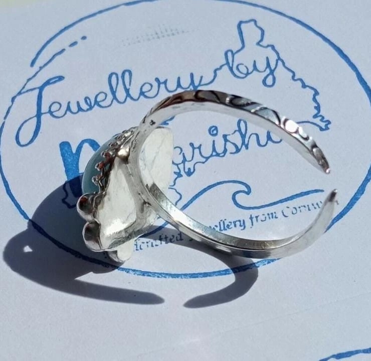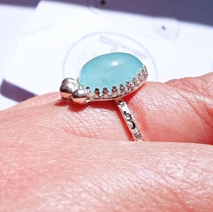 Surrounded in ornate design sterling silver around the stone, a solid silver back and recycled silver "bubbles" which I make by melting down my leftover silver!