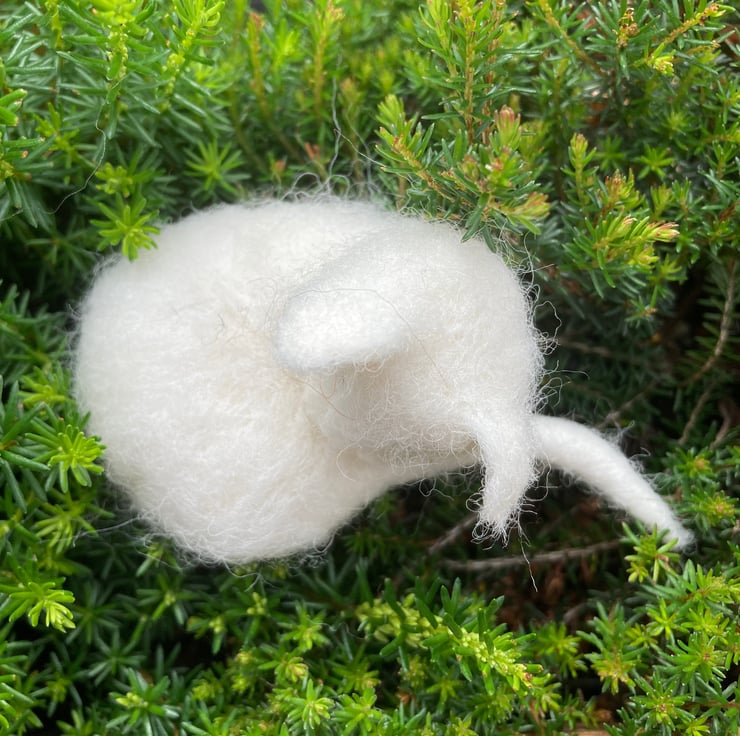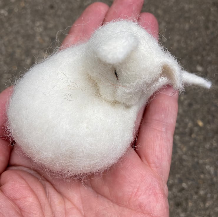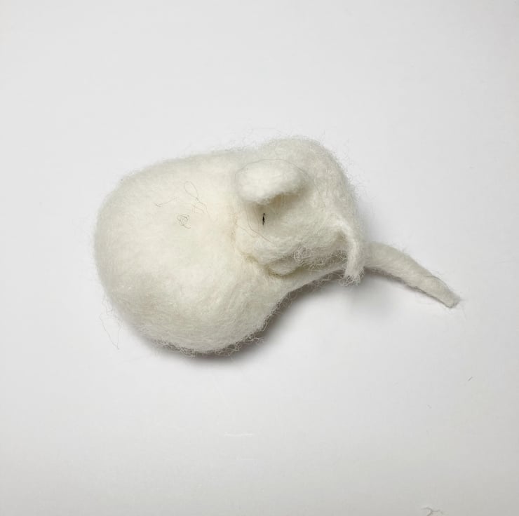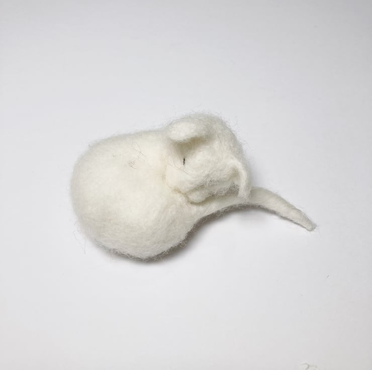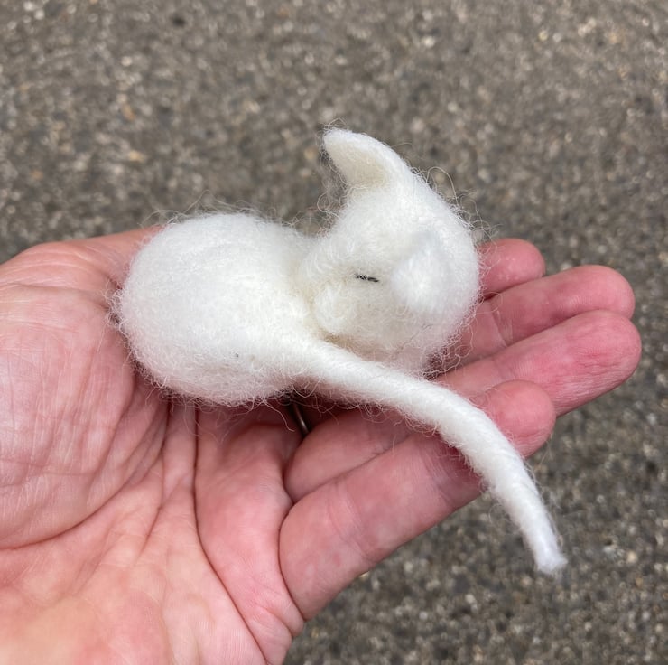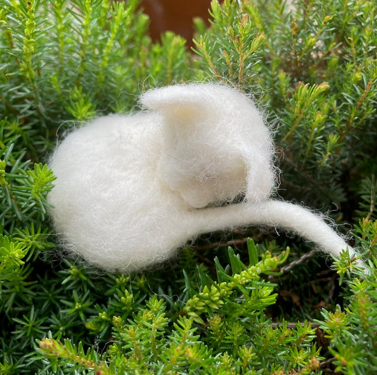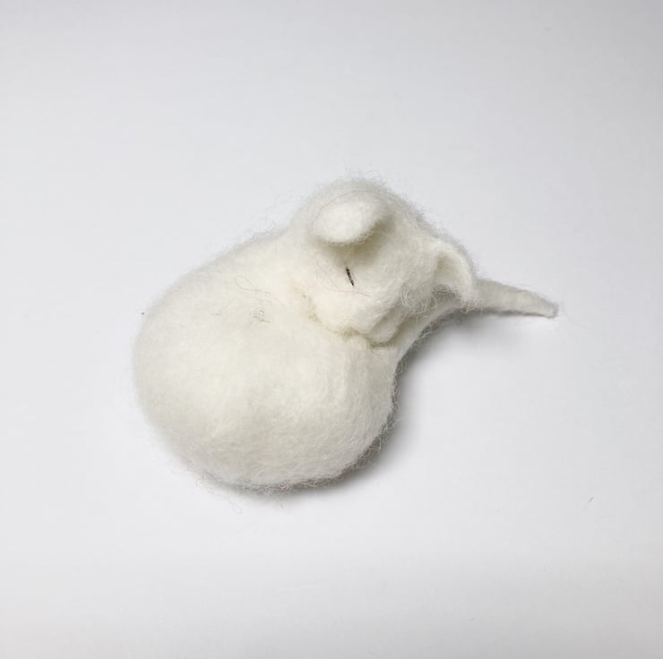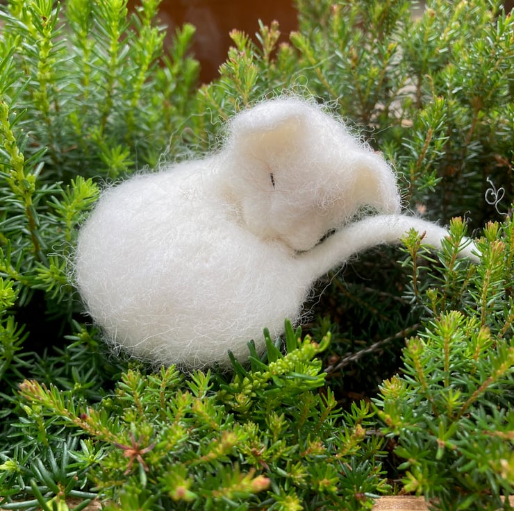This adorable miniature sleeping white cat has been needle felted using woollen fibres and a barbed felting needle to sculpt it into shape. The cat is posed in a curled up, sleeping position. It has a wired tail and the closed eyes have been added with small stitches. The model measures just 10cm (4") x 5cm (2") and fits in the palm of your hand.