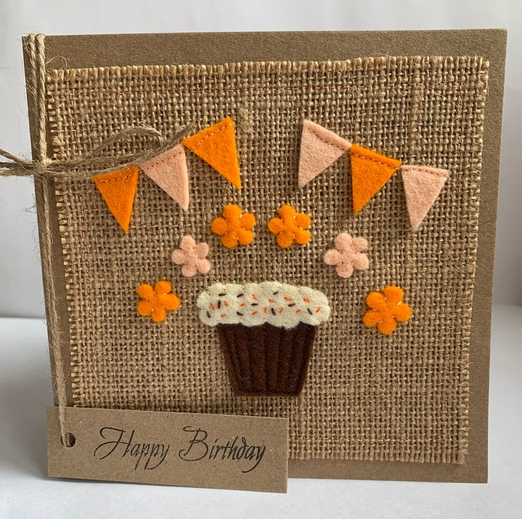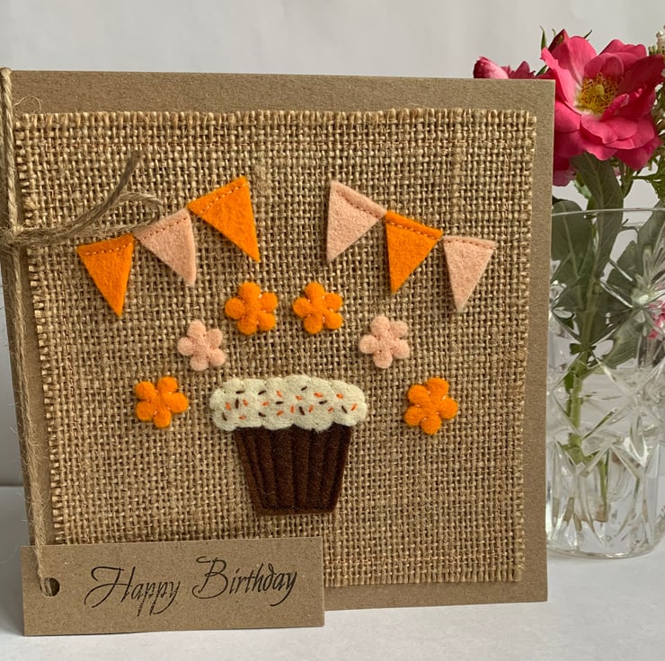 This handmade birthday card is decorated with a chocolate cupcake with peach and orange sprinkles, and decked with orange and pale peach bunting and flowers.