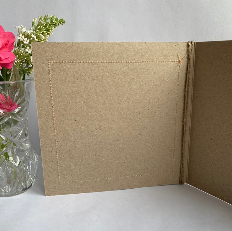 The hessian is machine stitched using a contrasting thread, onto a plain brown recycled card. This stitching is visible on the inside of the card.