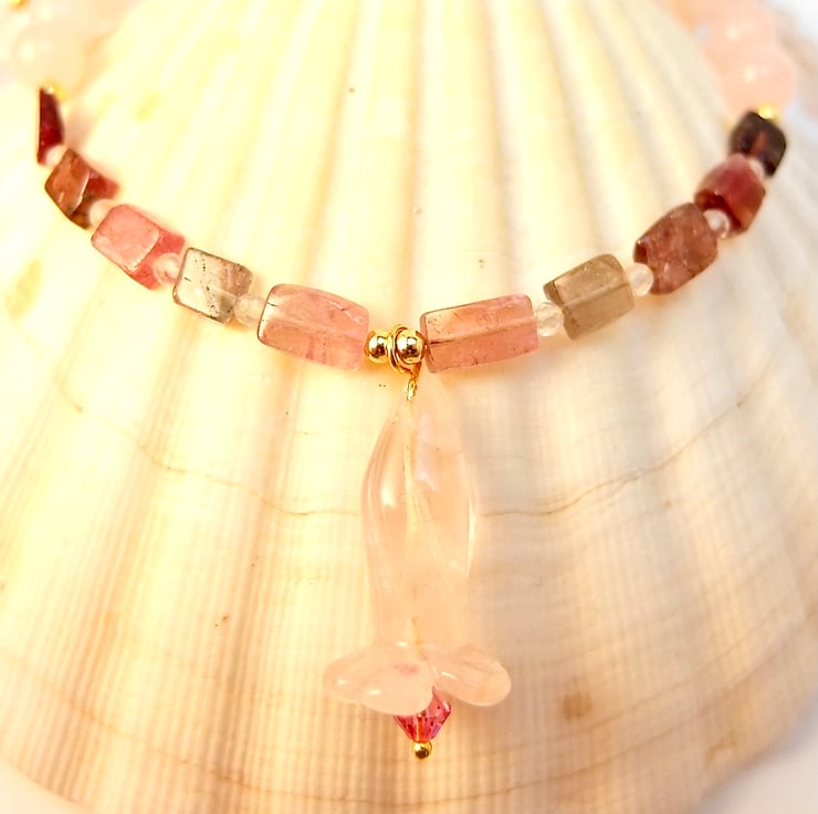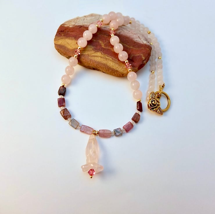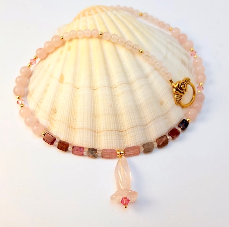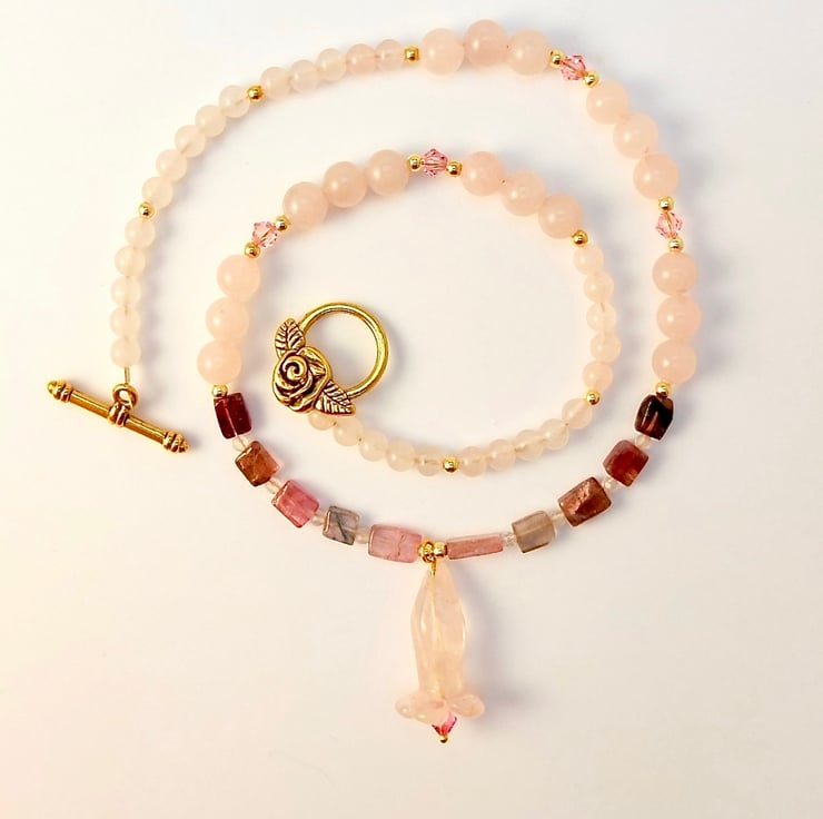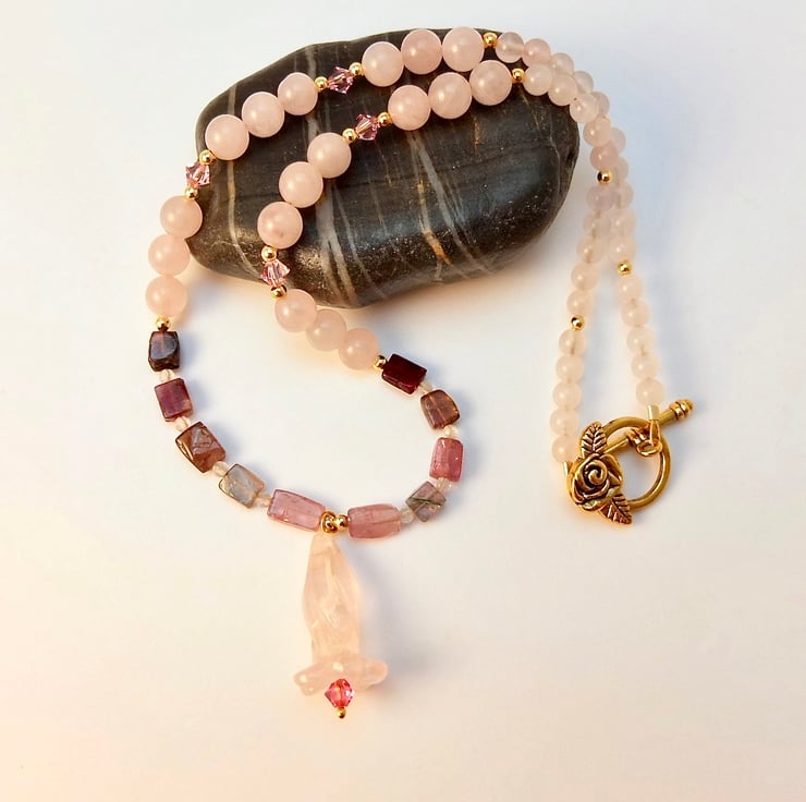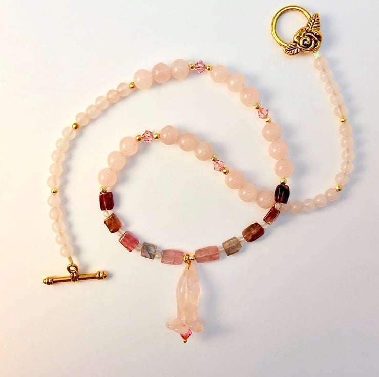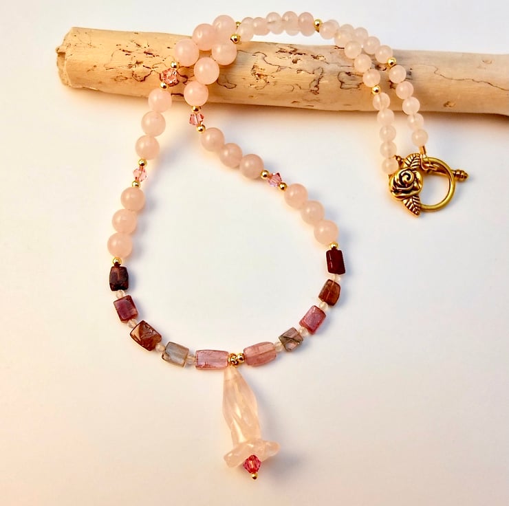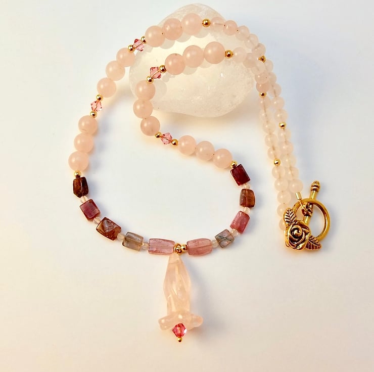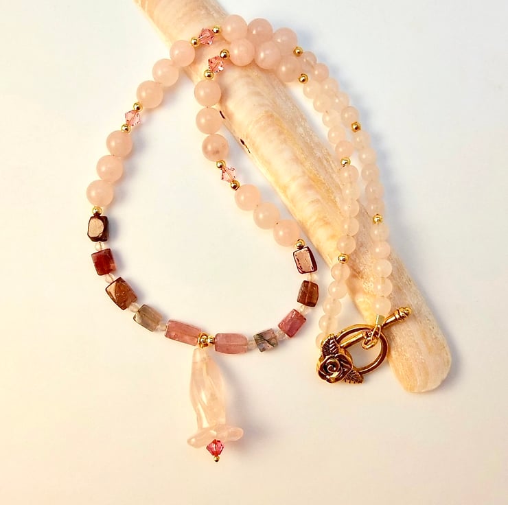 I have paired these Tourmaline stones with delicate pink Rose Quartz beads and a carved Rose Quarts flower.