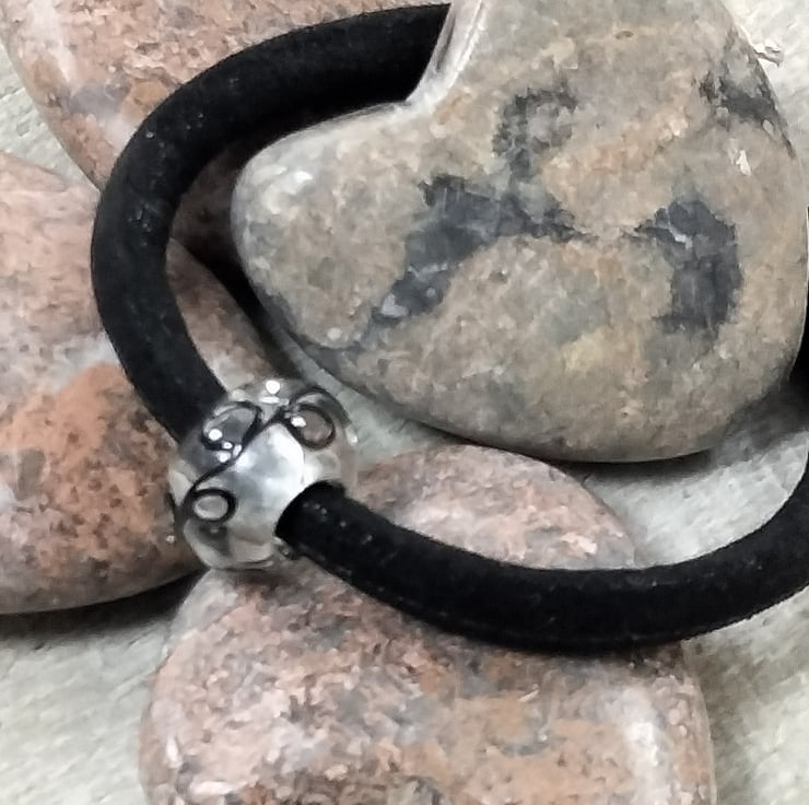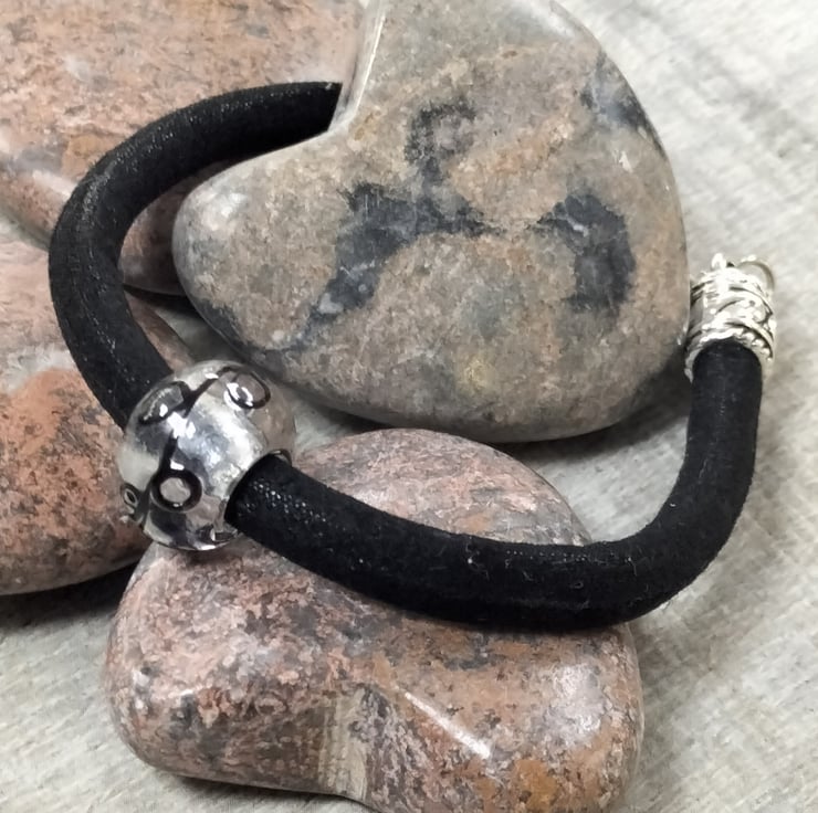 Black fabric bracelet with decorative glass bead that freely moves around the bracelet.