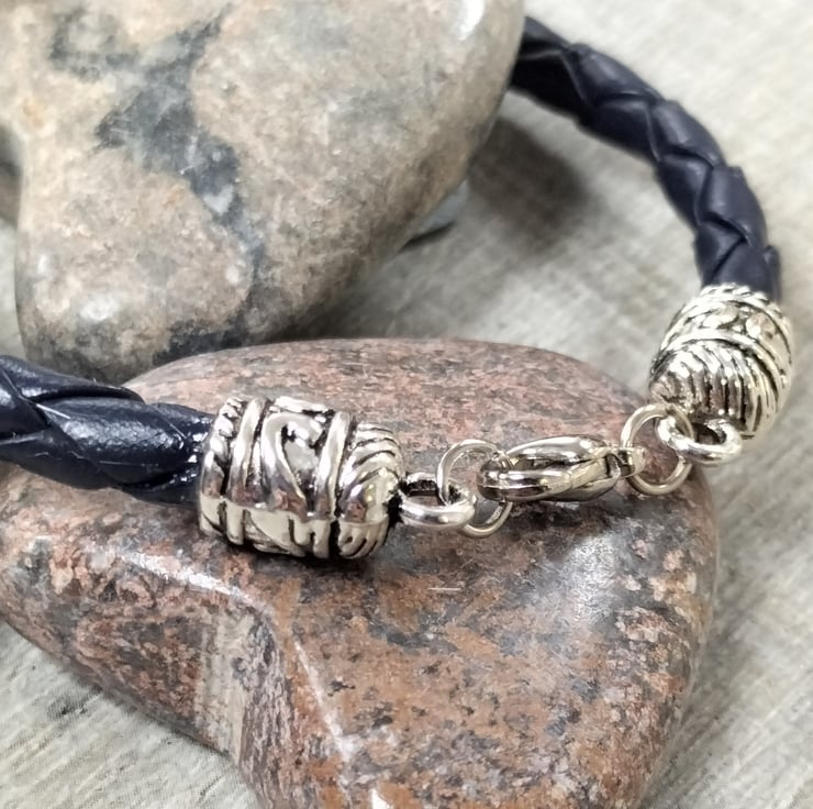Dark blue plated leather bracelet with 5mm strap and ornate ends and lobster catch.