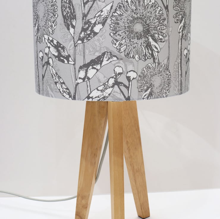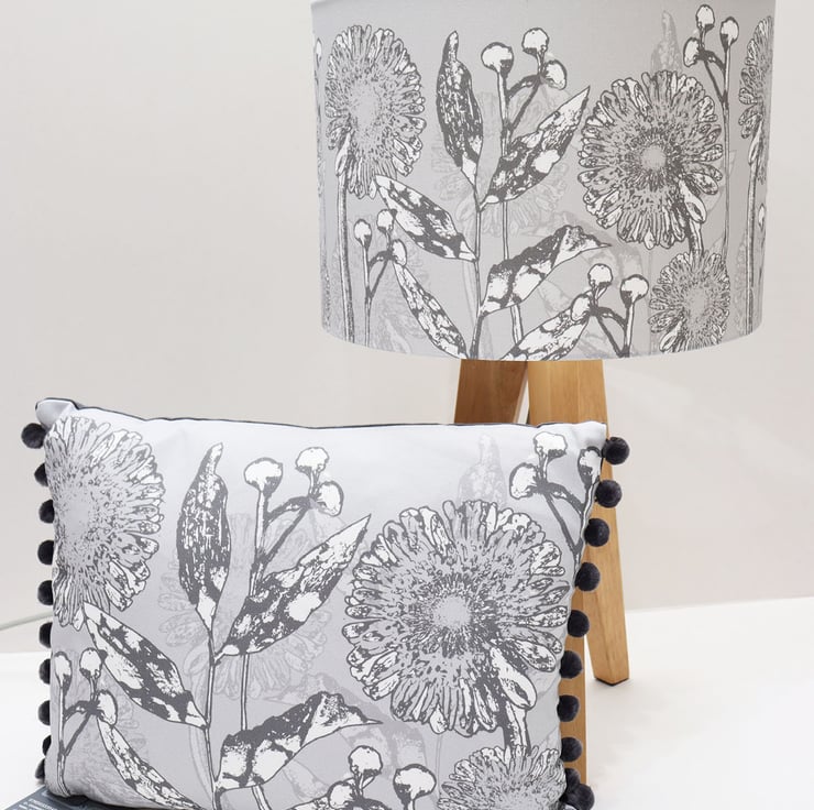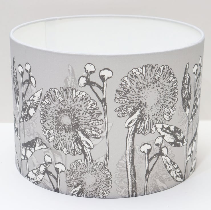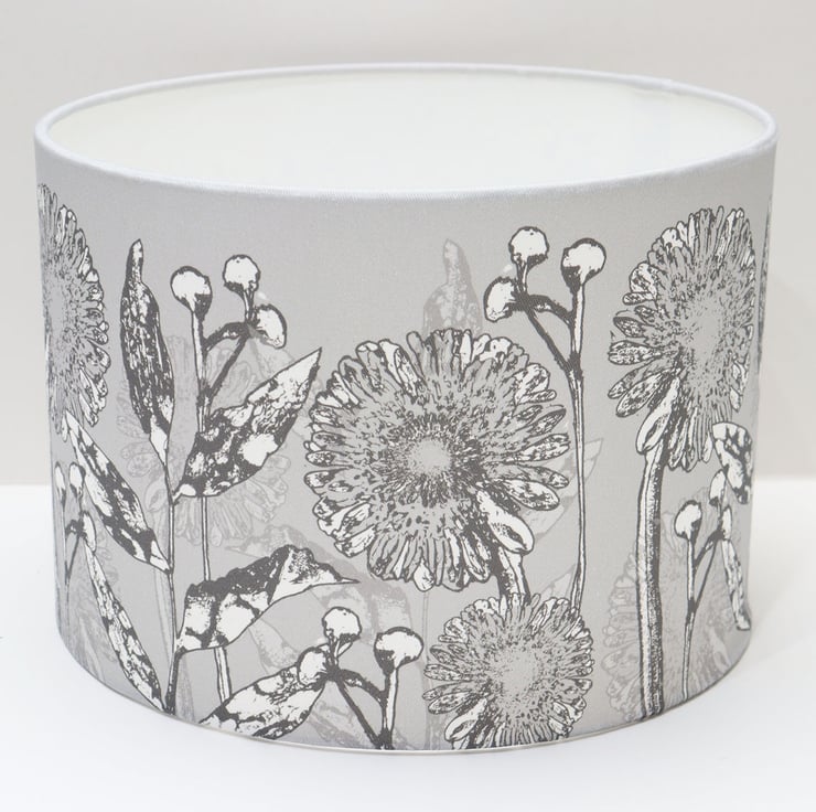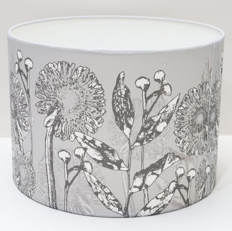 Handmade lampshade made from my Gerbra print fabric in shades of grey. This design is created by using the Gerbra flower and stems of greenery cut from my garden to produce a series of one-off Gelli plate prints, layered to create a final fabric design.