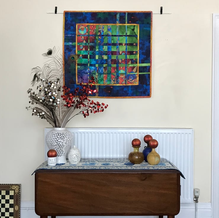 This piece is one of a variety of convergence quilts, and uses four fabrics for the central design. All outer fabrics are 100% cotton and the internal wadding is 80% cotton / 20% polyester.