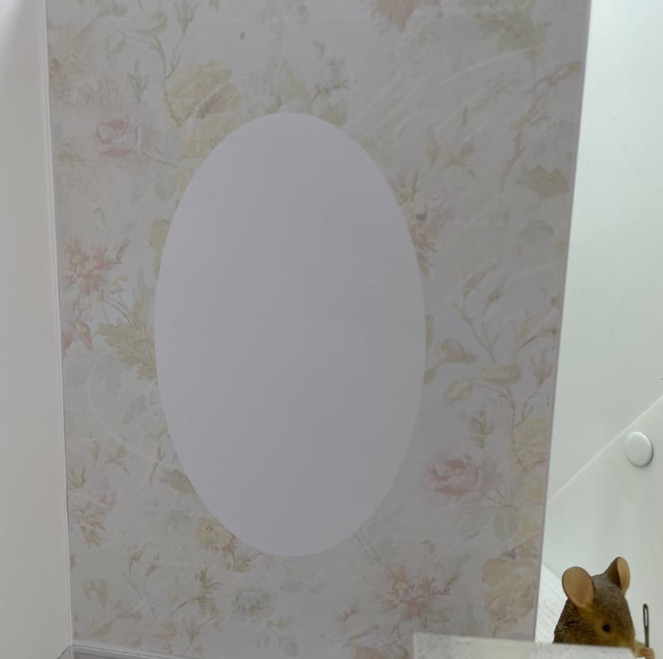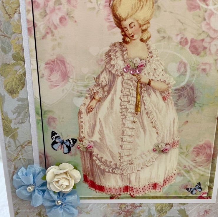 S5 pearl card with a Versaille patterned background. Topper of Marie Antoinette mounted onto pearl card, embellished with a paper rose and hand made faux silk flowers with pearl centres. Blue lace trim and a gold fleur de lis too e corner of the topper. Patterned to the inside back cover with a white oval, left blank for your own message.