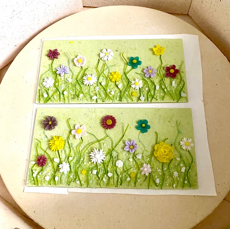 Created through a meticulous three-stage kiln firing process spanning over 45 hours, this artwork combines powdered glass, the unique freeze-and-fuse technique, and hand-placed details to bring each flower to life. The result is a richly textured, dimensional glass panel that captures the essence of a sunlit meadow.