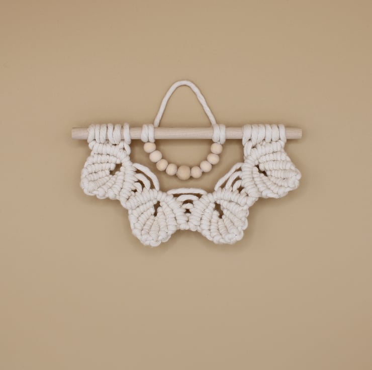 Cute mini macramé wall decoration, small enough to fit into tiniest of spaces. This miniature design is shell themed and has a string of wooden beads (pearls) in the centre and is followed by a semi circle chain of shells.