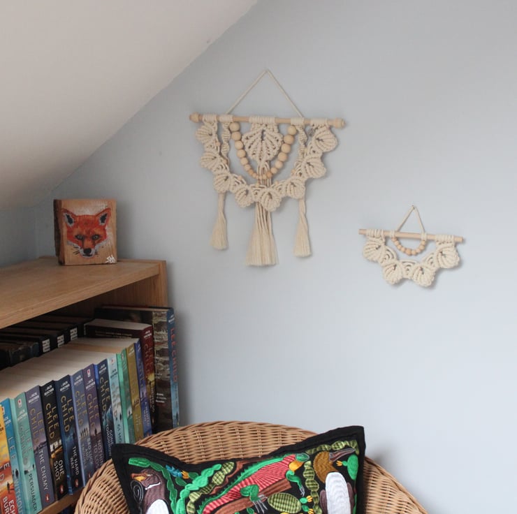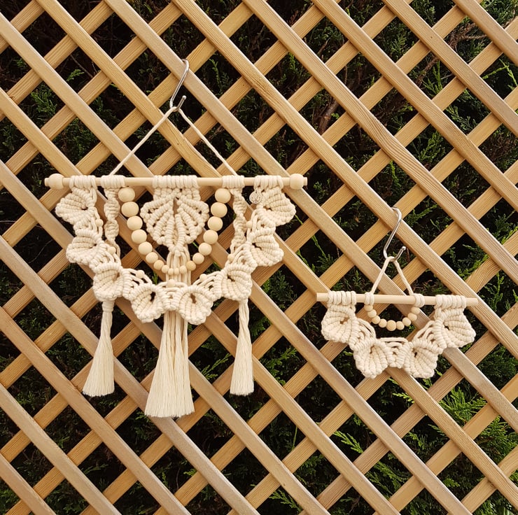 Measurements: The dowel used is 15cm long and from the top of the dowel the macrame piece hangs 9cm down.