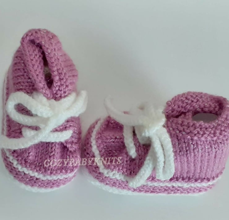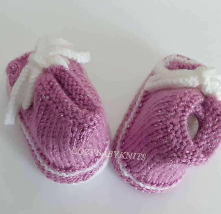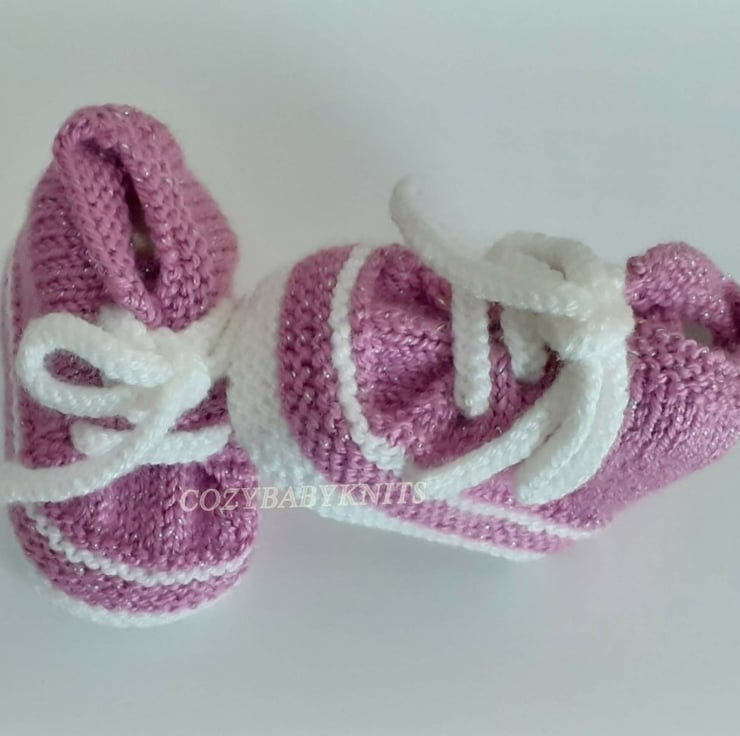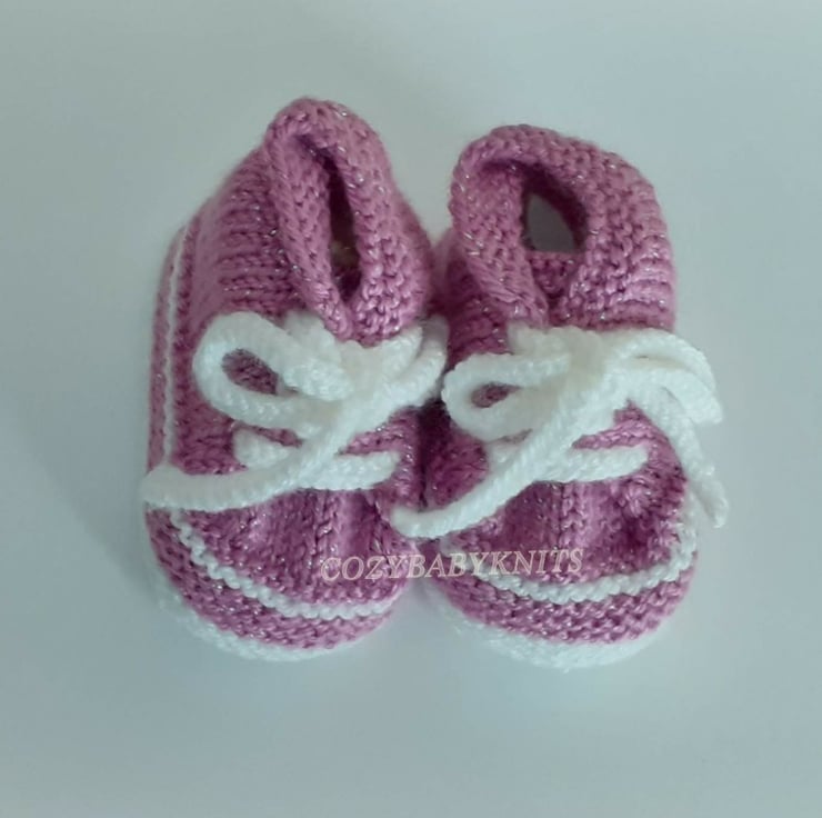 0 - 3 months size. Knitted in a soft double knit. The wool has a glitter thread that makes them perfect for that outfit or that special occasion.