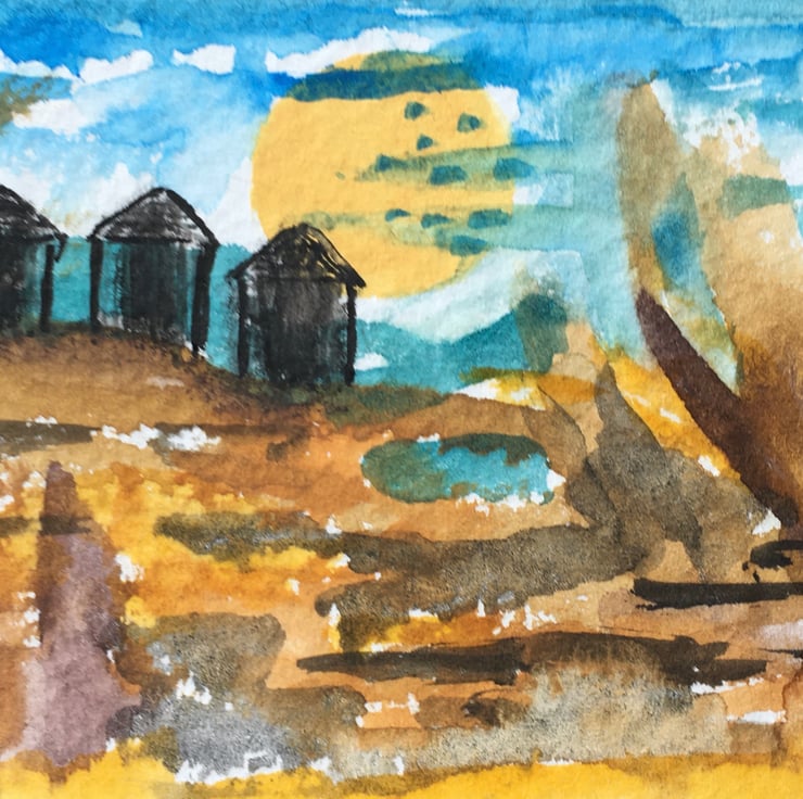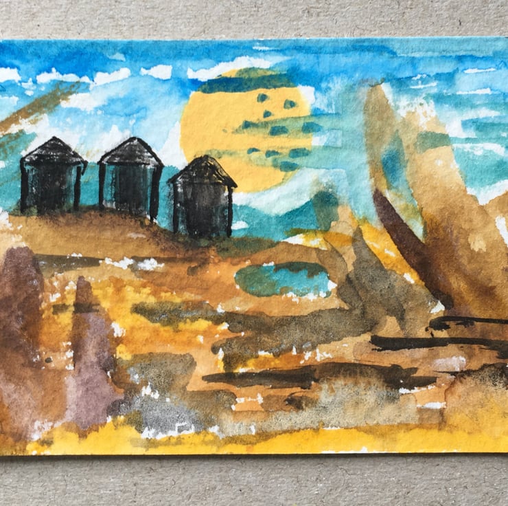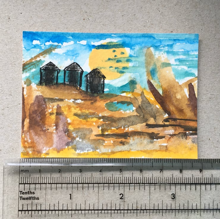 This aceo measures 3.5” x 2.5” and is painted using Artist quality paint on stiff watercolour paper. It shows a row of beach huts in silhouette on a semi abstract beach.