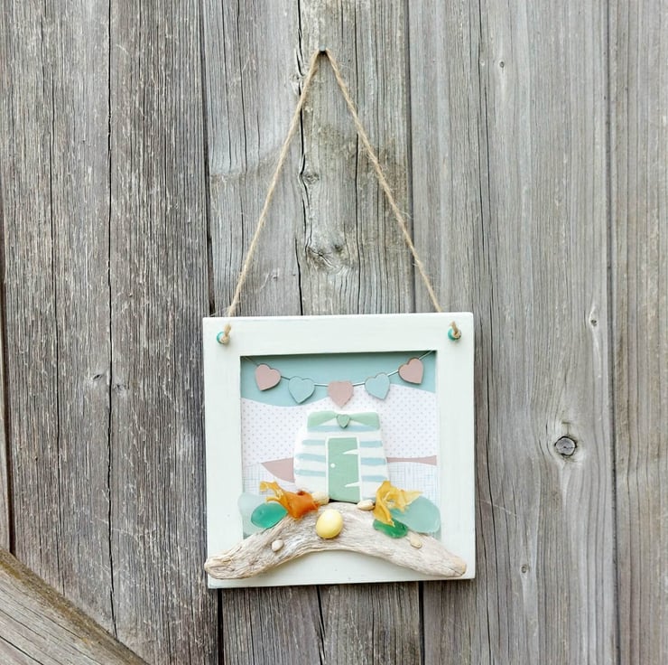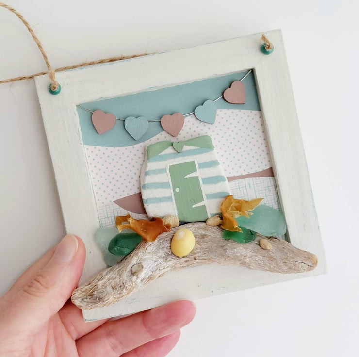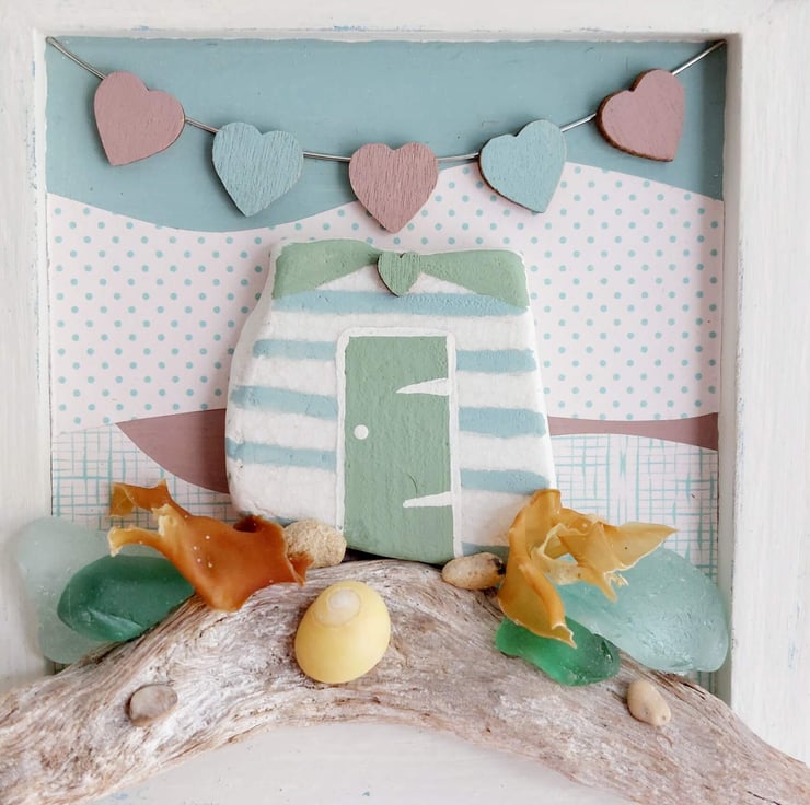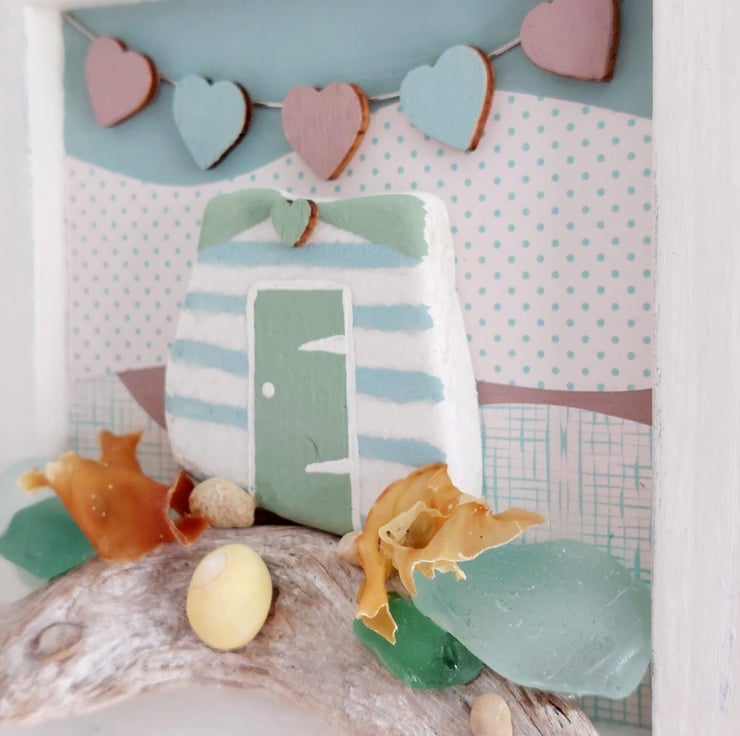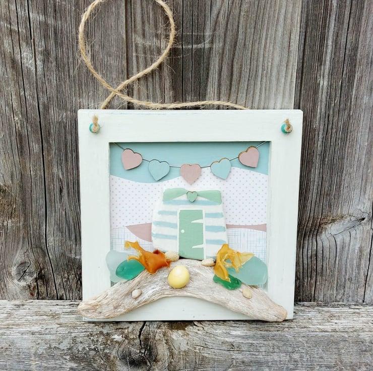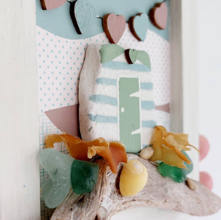 This piece features a square wooden box frame with a white-painted outer edge and an inner section in pastel blue and pink, accented with patterned paper details. It is adorned with driftwood, sea glass, seaweed and a shell. The beach hut is crafted from a piece of beach pottery, painted white with charming blue stripes and a green door. To complete the scene, green sea glass and driftwood form a beach underneath.