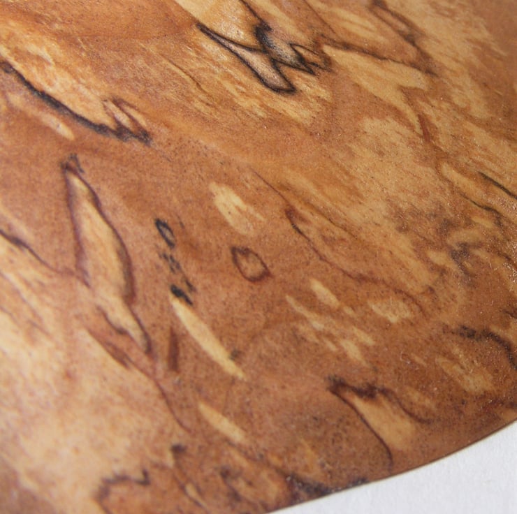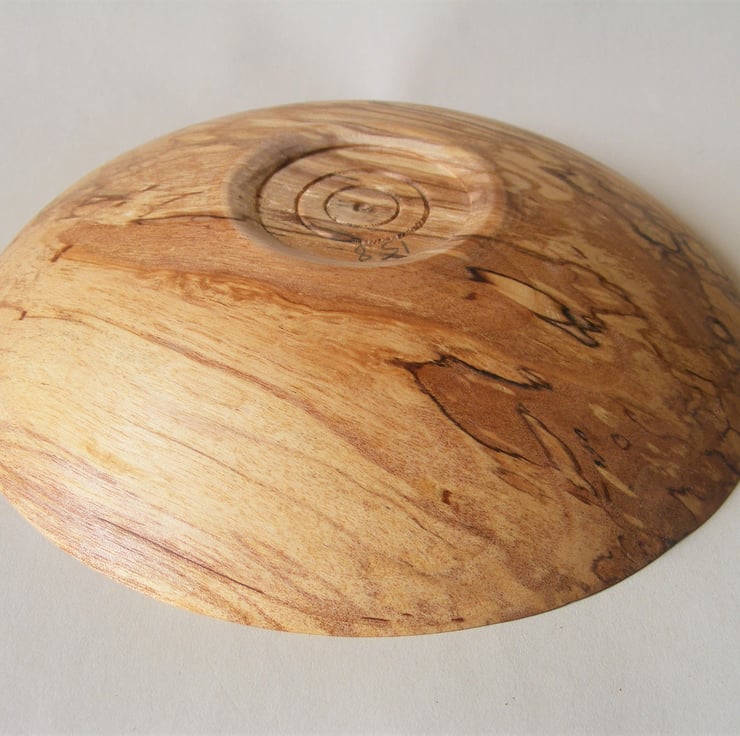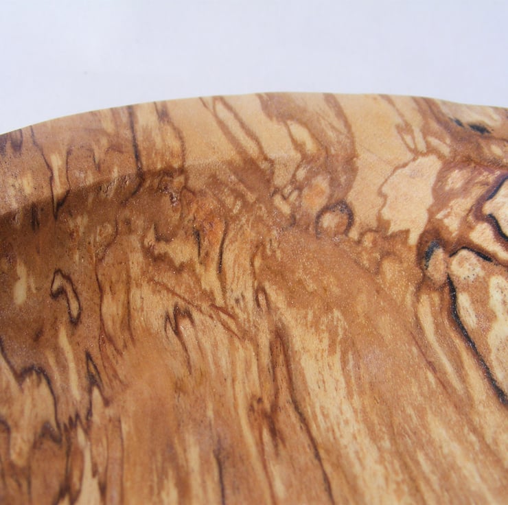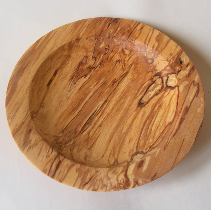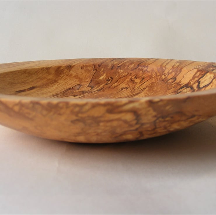 Spalted silver Birch bowl. 154 x 30mm (15.4 x 3cm). A striking shallow decorative bowl made from Spalted Silver birch. it has a very narrow base, nicely curving underside and a wide sloped in rim. The colours and patterns are lovely with streaks of cream, brown and lines of dark brown. It would make a lovely decoration or gift.