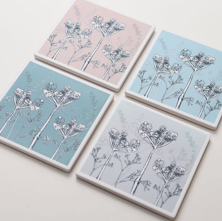 Set of four coasters featuring Cow Parsley and Seed heads on a pastel coloured background. You will receive one of each colour (pink, blue, green and light grey).